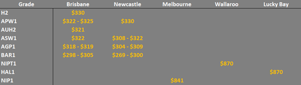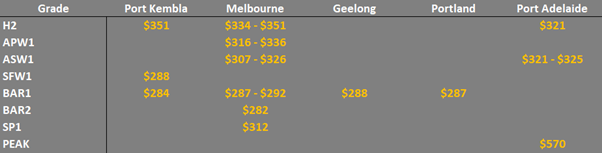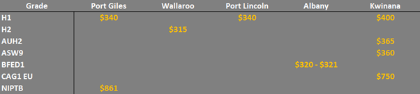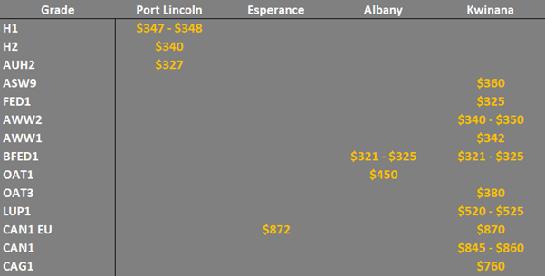 Note: GTA location differentials are used to convert prices to a port equivalent price, actual freight rates can differ particularly in the eastern states. You can offer any grade for sale to create demand.