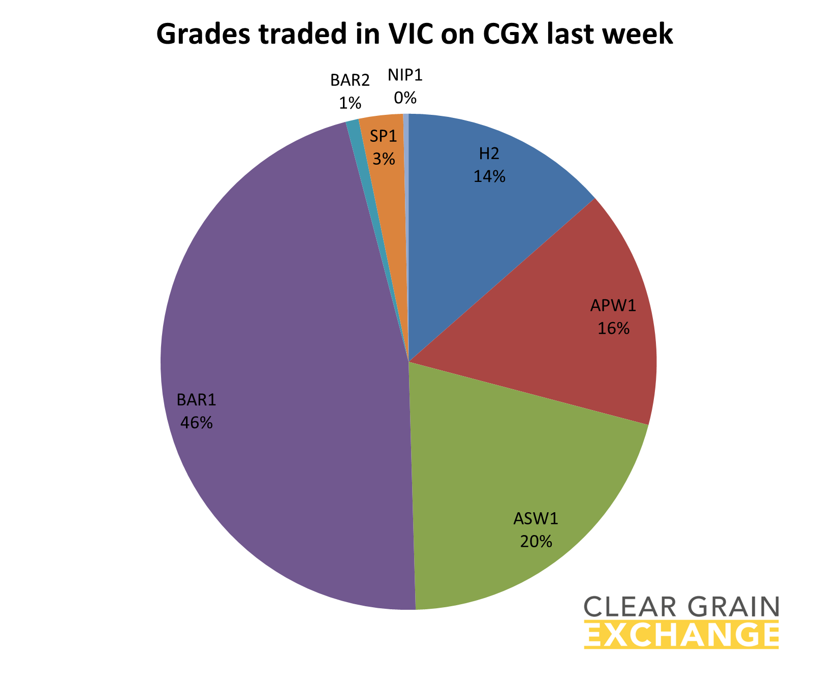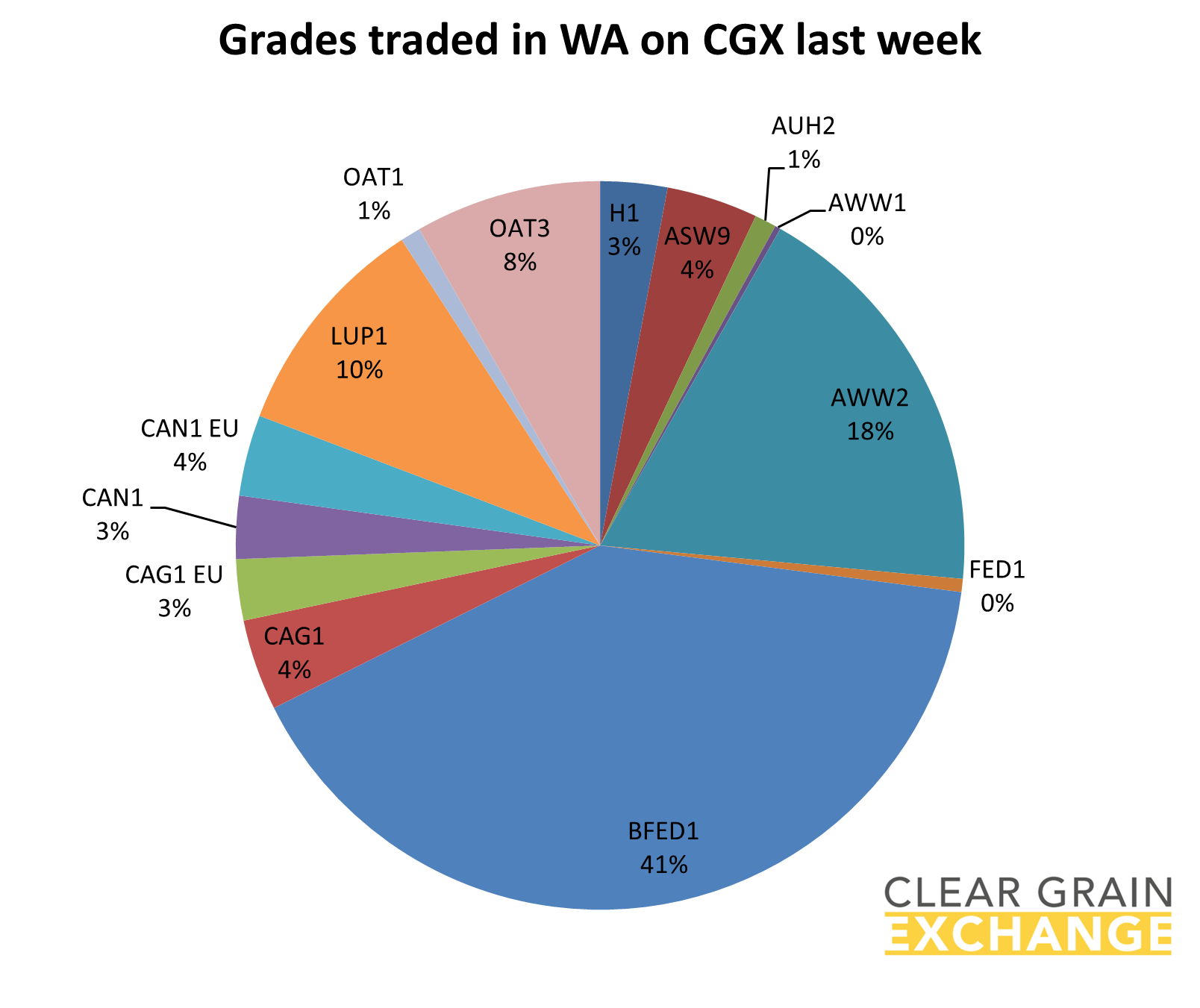 30 different buyers purchased 27 grades of wheat, barley, canola, lentils, lupins, peas and oats across 14 port zones around Australia last week.