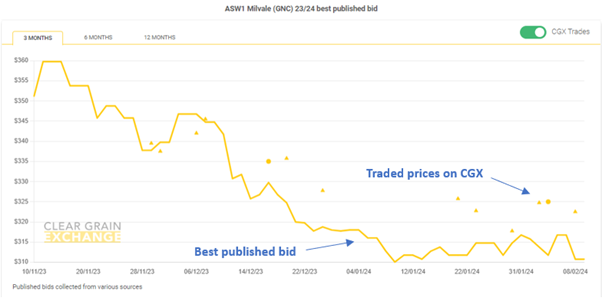 Grain that was trading on CGX was often at better prices than those advertised by published bids (see charts below for examples).