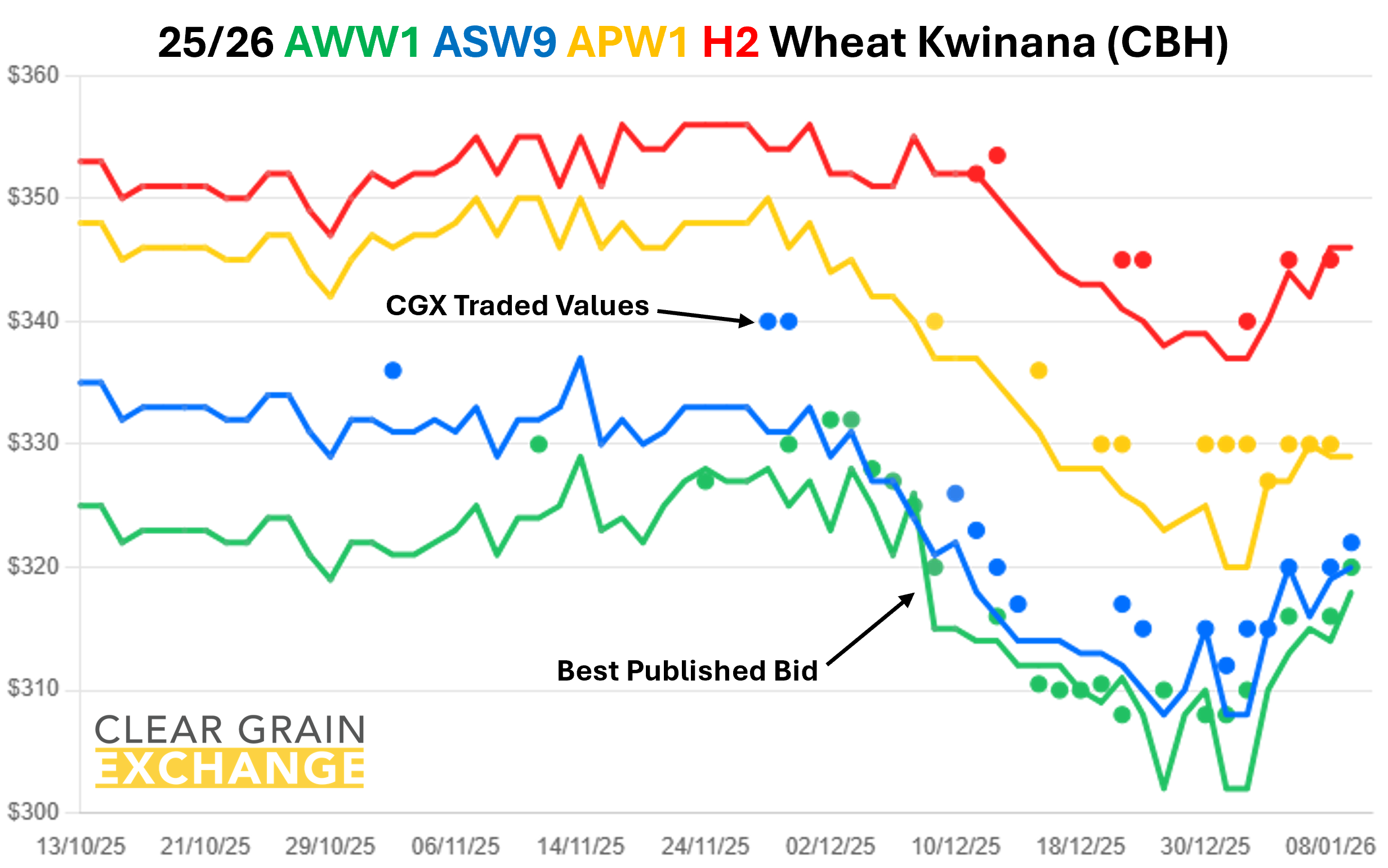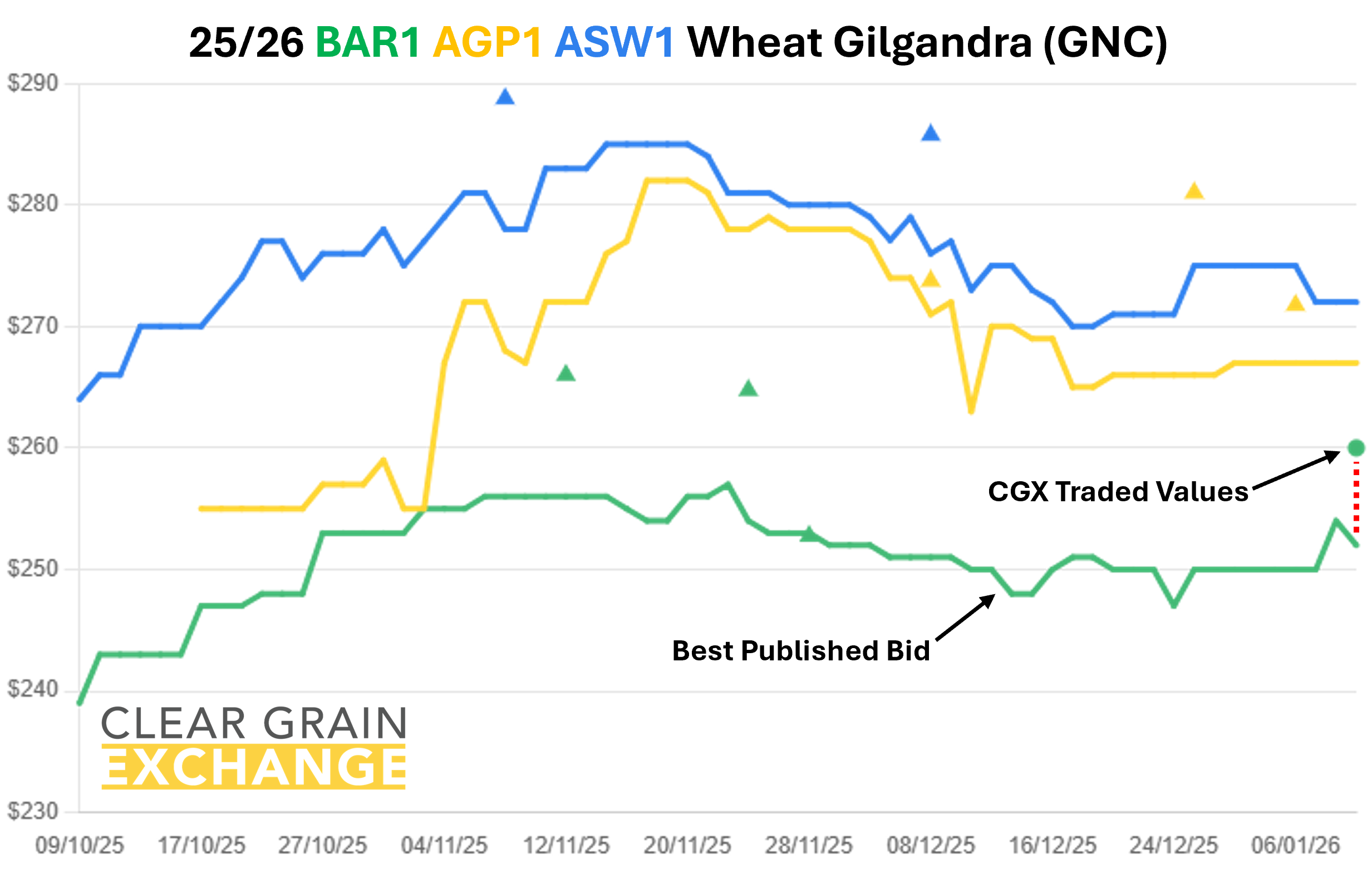 The prices traded through the exchange at a port track (eastern states) or FIS (in WA) level are provided below, but if you're reading this email you will have your own CGX account so login and use it to see what's trading, what's offered, and what's being bid at sites to help you determine the value of grain in your area.