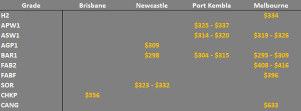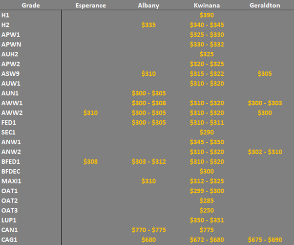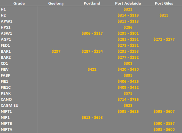 Note: GTA location differentials are used to convert prices to a port equivalent price, actual freight rates can differ particularly in the eastern states. You can offer any grade for sale to create demand.