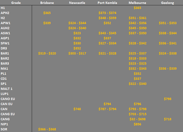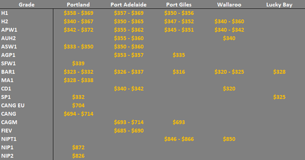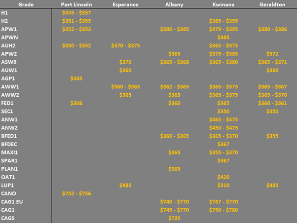 Note: GTA location differentials are used to convert prices to a port equivalent price, actual freight rates can differ particularly in the eastern states. You can offer any grade for sale to create demand.