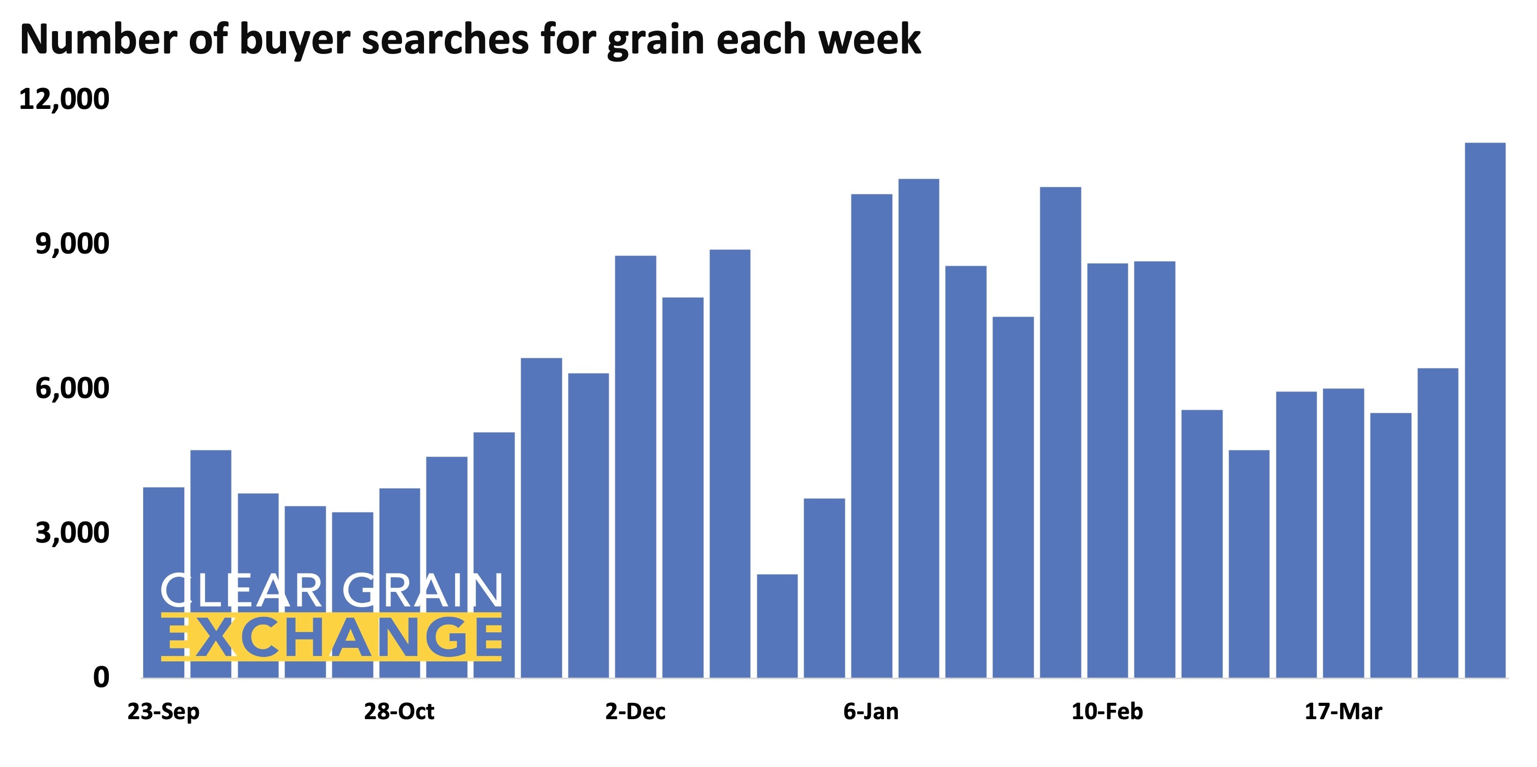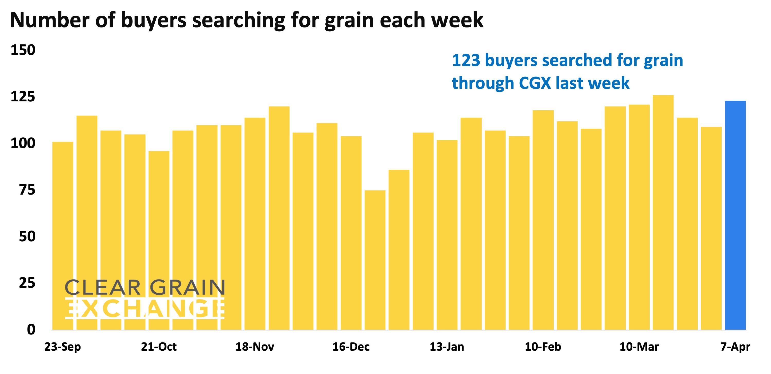 58 buyers bid up to match grower offer prices and purchase grain. 69 buyers bid for grain and a total of 123 buyers made 11,117 searches for grain listed for sale on the exchange.
