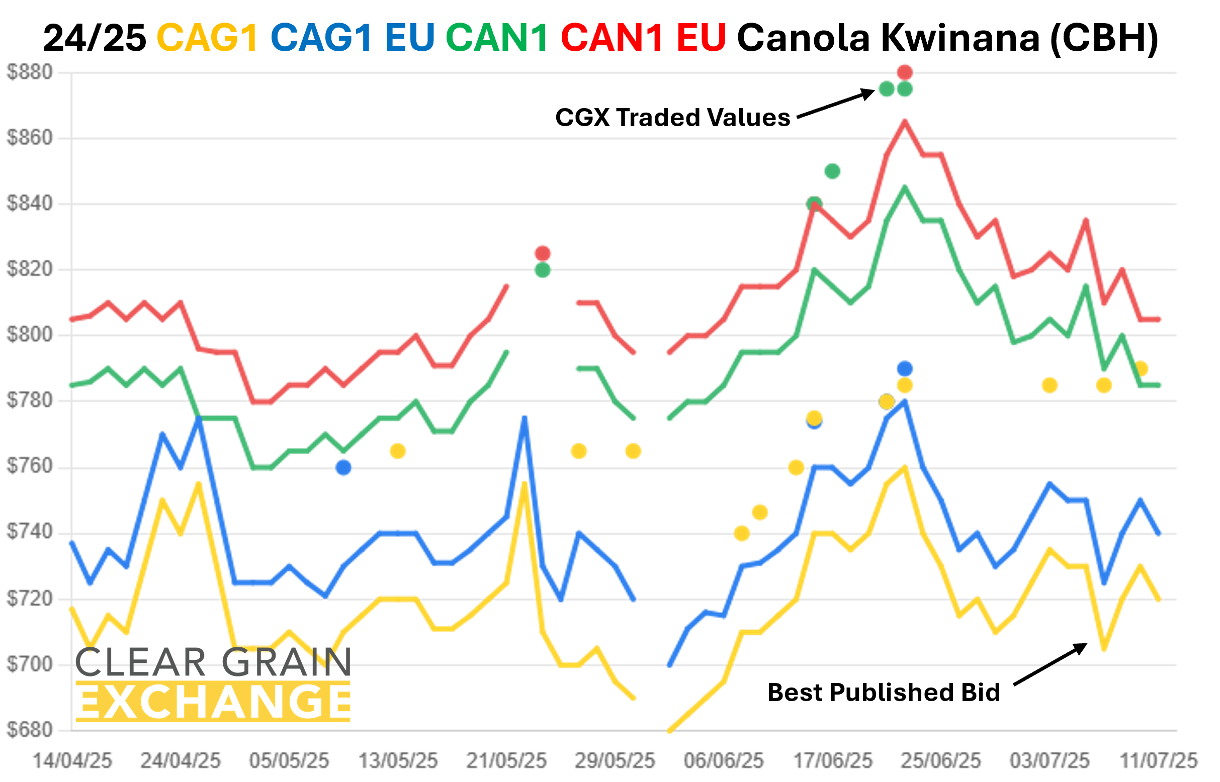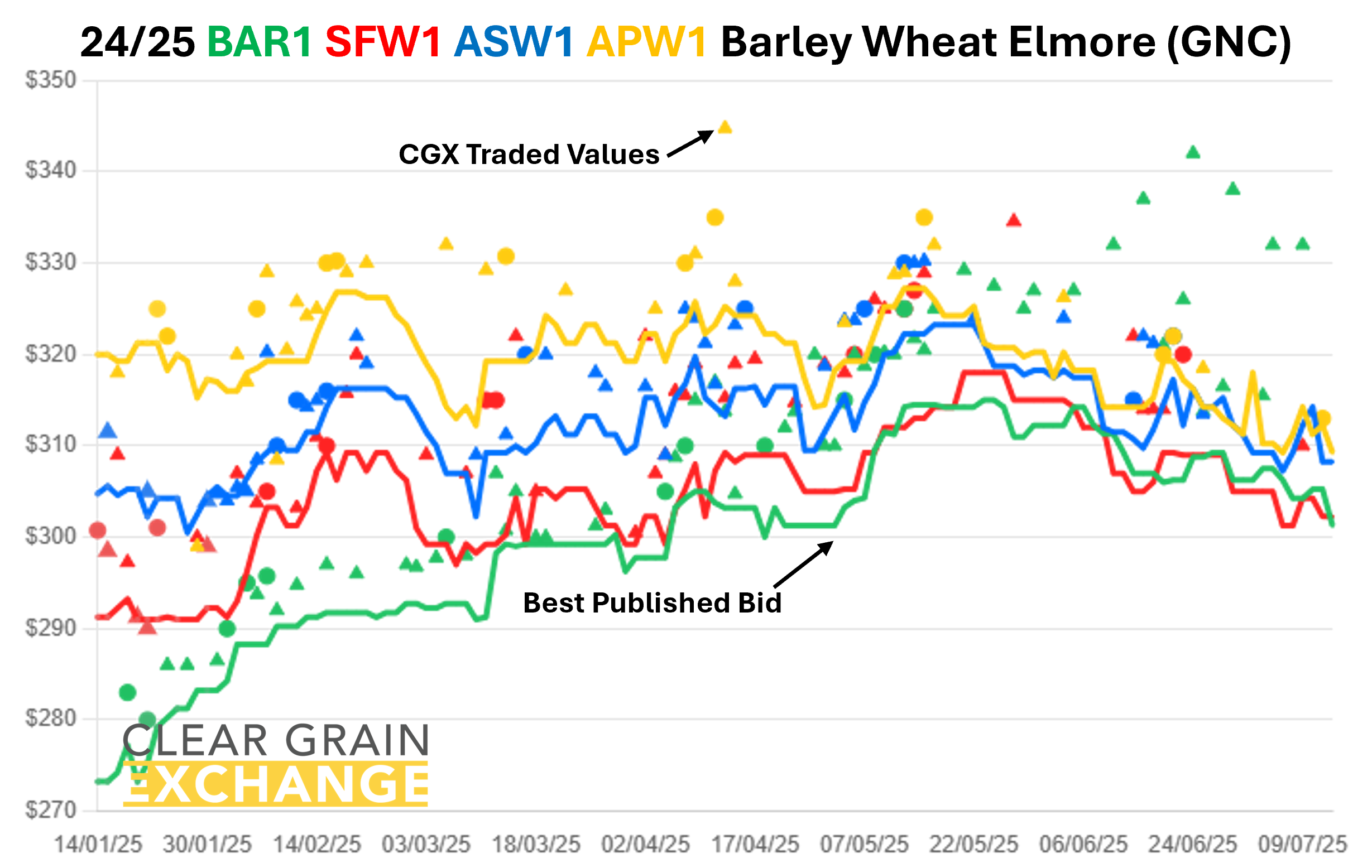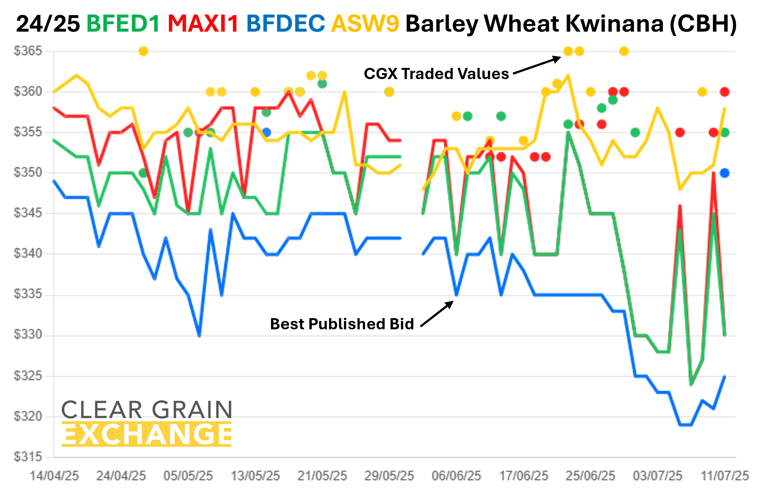 The prices traded through the exchange at a port track or FIS (in WA) level are provided below, but if you're reading this email you will have your own CGX account so login and use it to see what's trading, what's offered, and what's being bid at sites to help you determine the value of grain in your area.