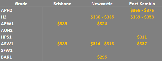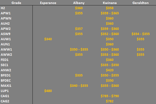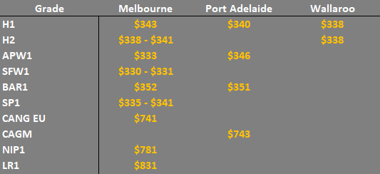 Note: GTA location differentials are used to convert prices to a port equivalent price, actual freight rates can differ particularly in the eastern states. You can offer any grade for sale to create demand.
