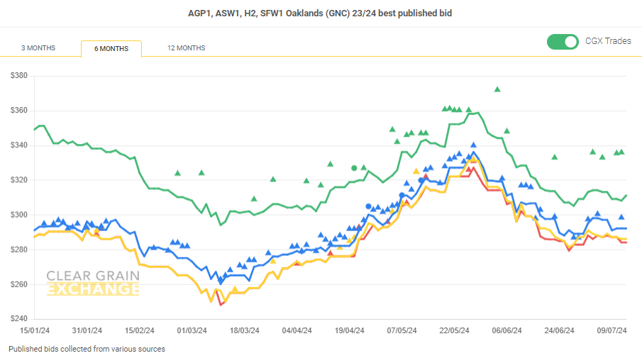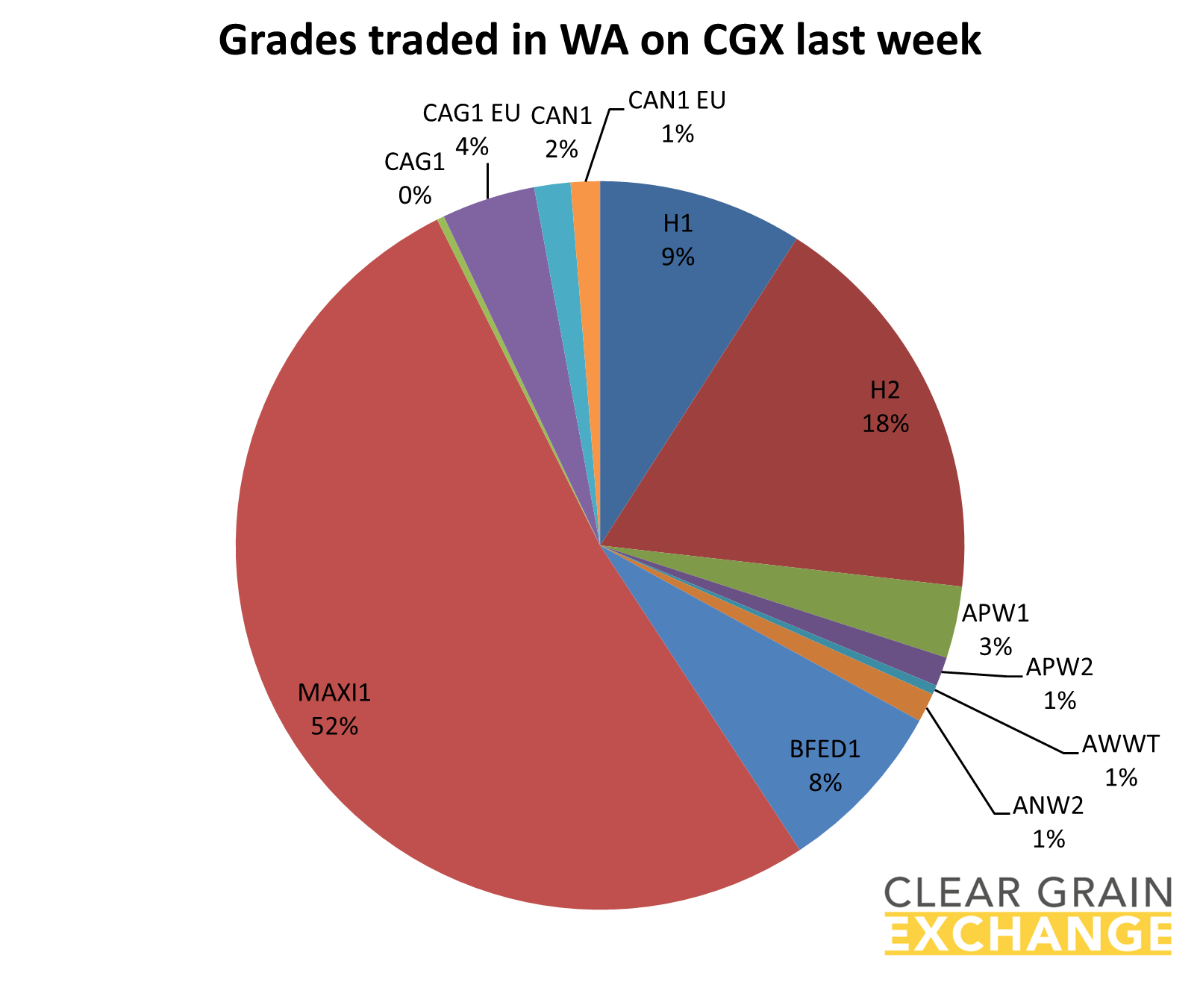 Wheat grades made up 38% of all grain traded on CGX last week with ASW1 trading $350/t Pt Kembla and $340/t Melbourne. Higher protein milling grades continue to trade at better values with APH2 trading $440/t Newcastle, H1 and H2 trading $418/t and $375/t Kwinana respectively, and H2 trading $370/t Melbourne as examples. ANW2 traded $490/t Kwinana. Wheat stored on-farm was also trading through igrain with APW1 and ASW1 trading $335/t and $325/t up-country Victoria as examples.