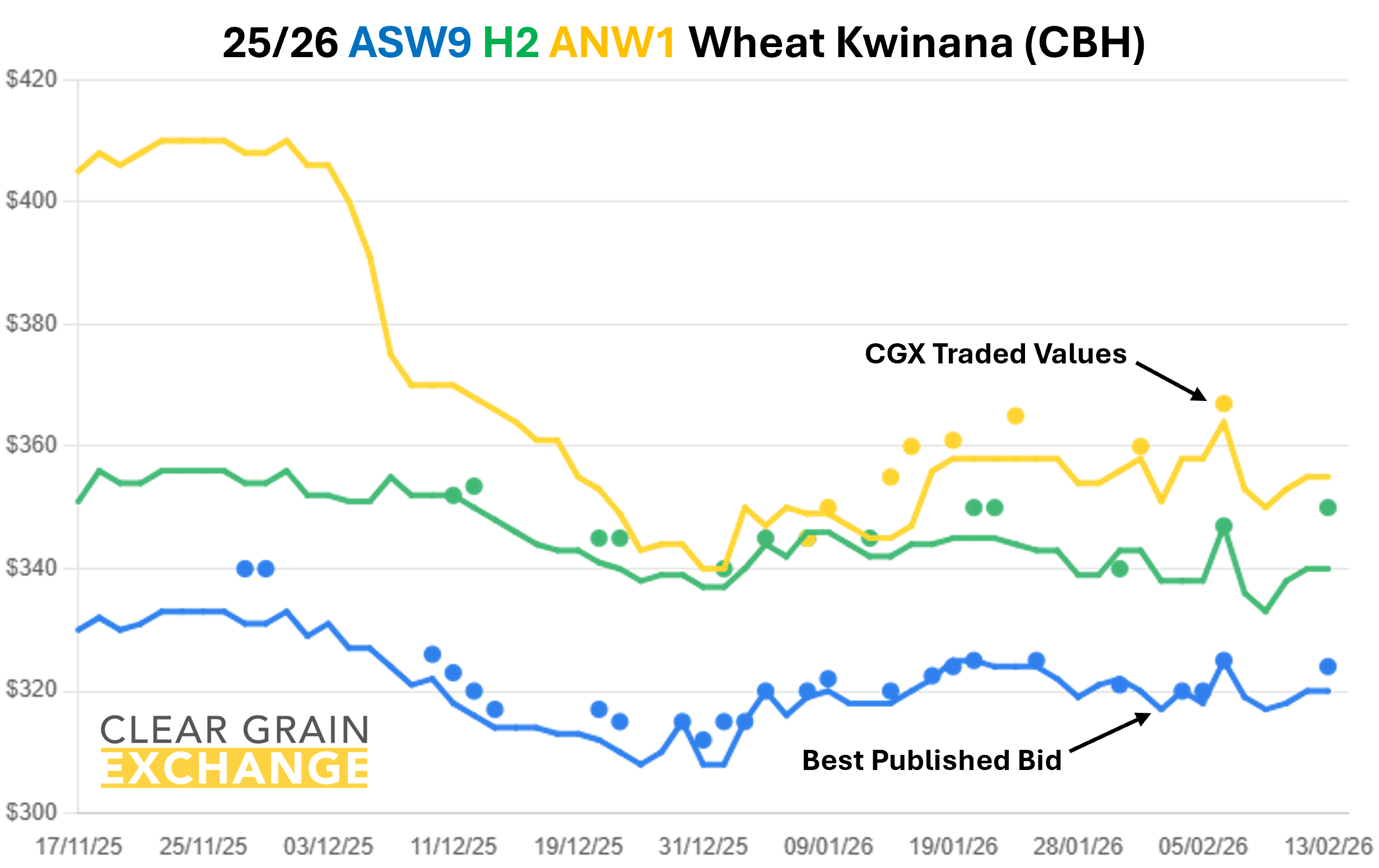 The prices traded through the exchange at a port track (eastern states) or FIS (in WA) level are provided below, but if you're reading this email you will have your own CGX account so login and use it to see what's trading, what's offered, and what's being bid at sites to help you determine the value of grain in your area.
