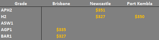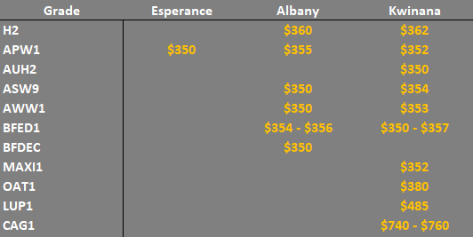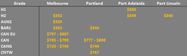 Note: GTA location differentials are used to convert prices to a port equivalent price, actual freight rates can differ particularly in the eastern states. You can offer any grade for sale to create demand.