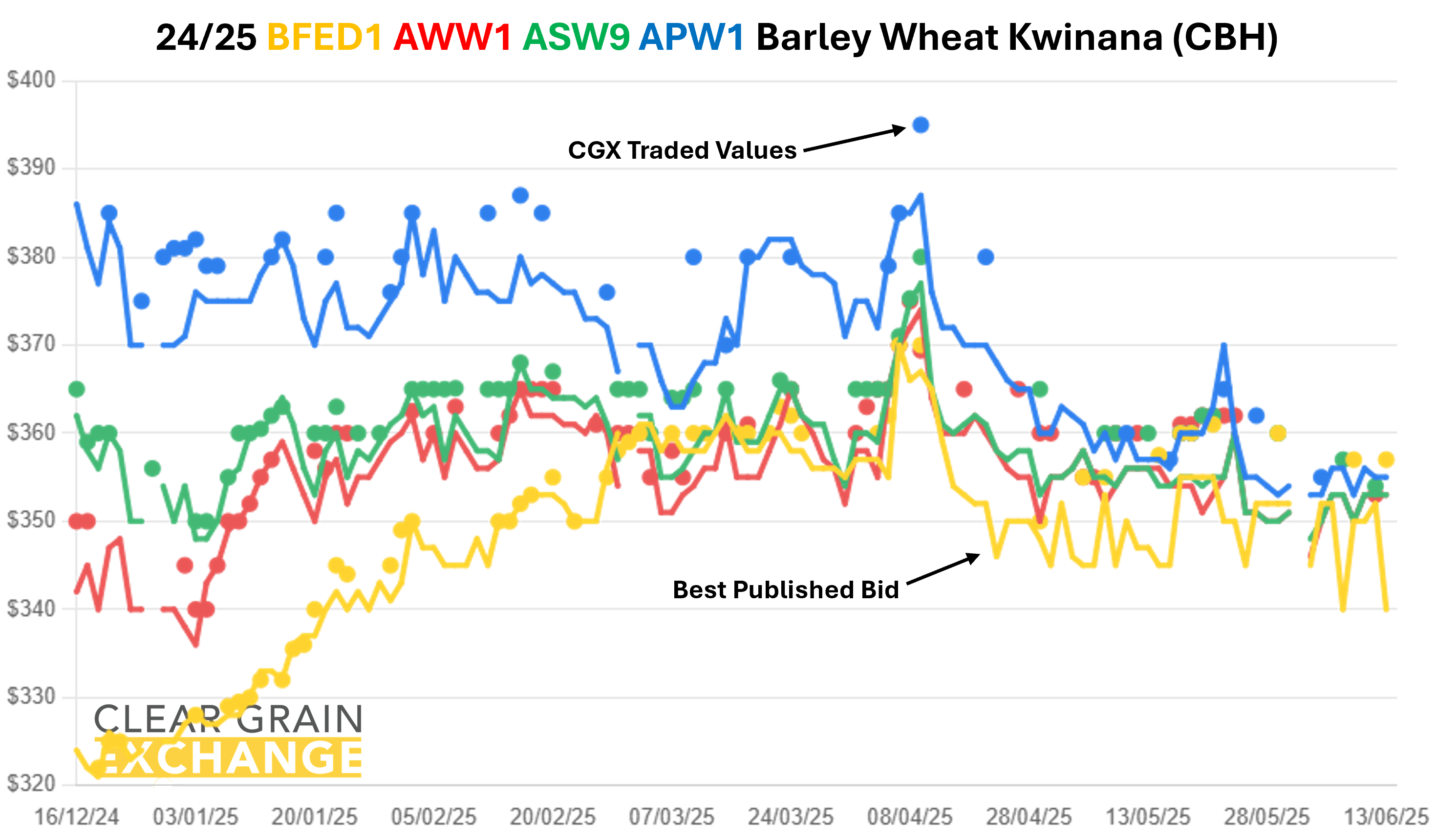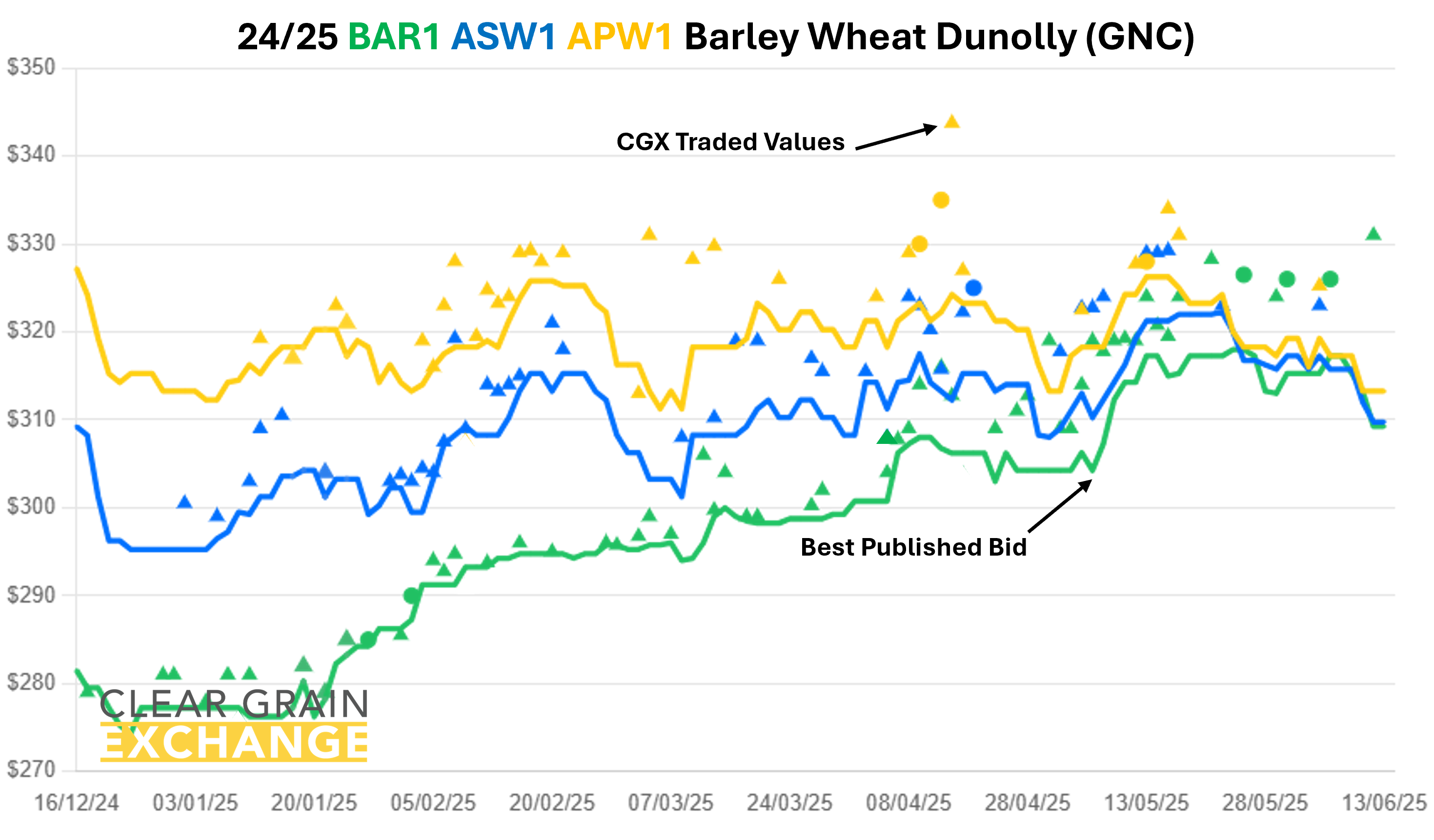 The prices traded through the exchange at a port track or FIS (in WA) level are provided below, but if you're reading this email you will have your own CGX account so login and use it to see what's trading, what's offered, and what's being bid at sites to help you determine the value of grain in your area.