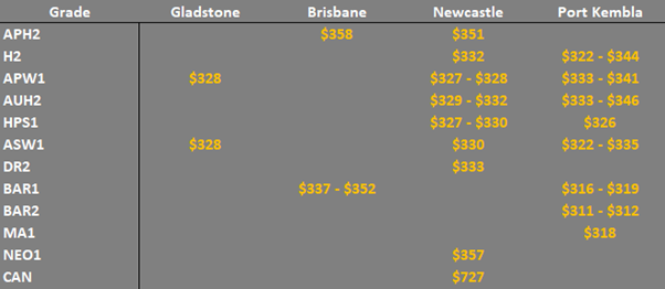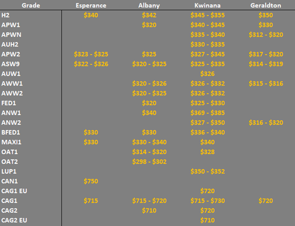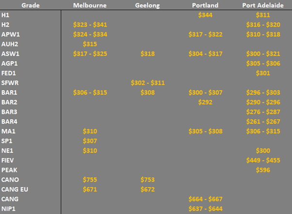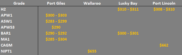 Note: GTA location differentials are used to convert prices to a port equivalent price, actual freight rates can differ particularly in the eastern states. You can offer any grade for sale to create demand.