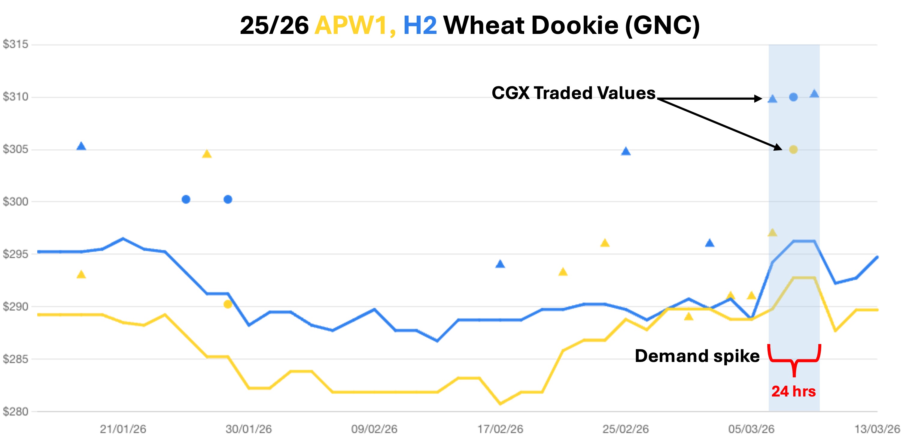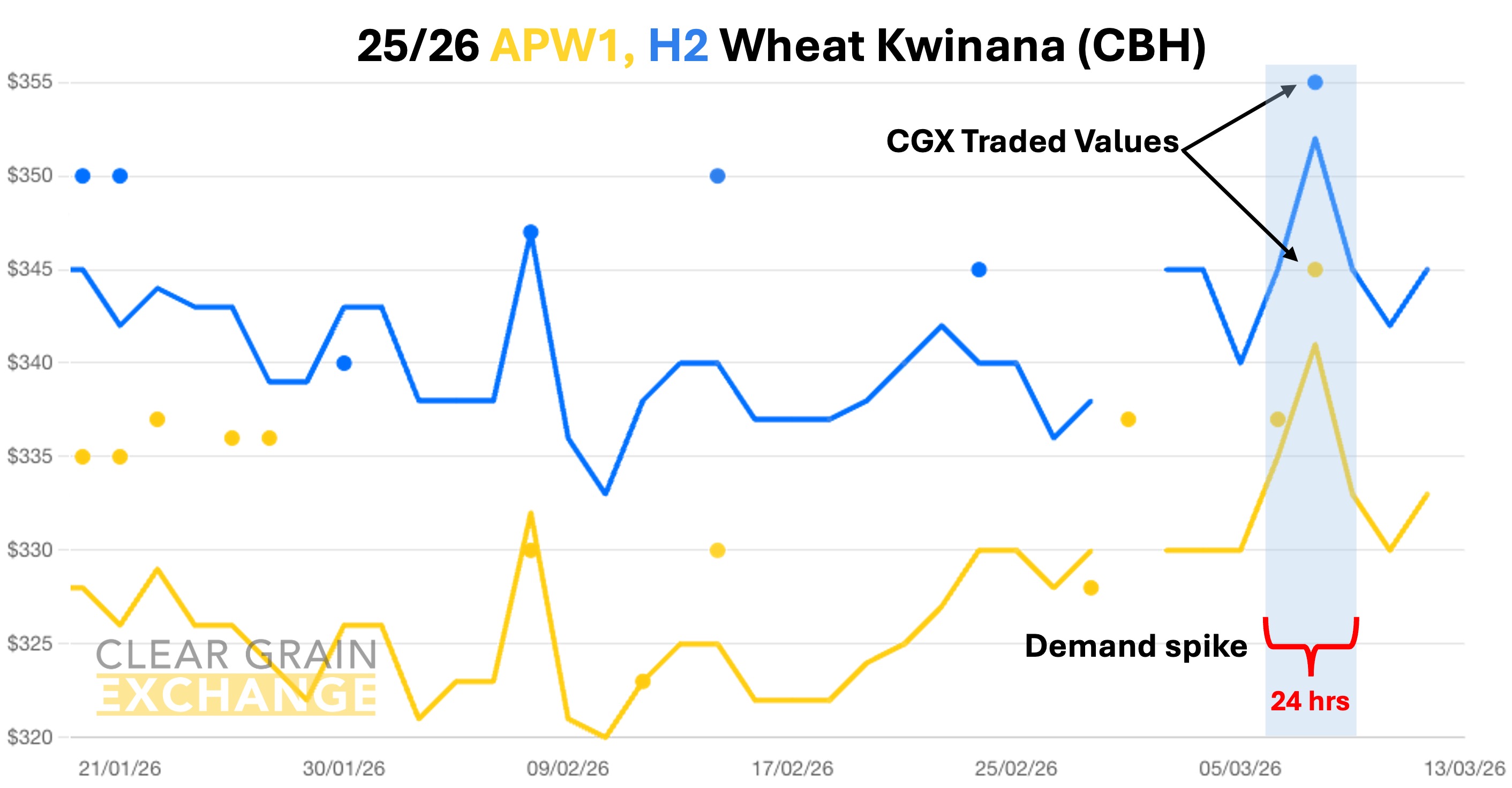 Buyers have been actively trying to buy Australian grain. So when markets moved and provided them an opportunity to pass on those gains and lift prices, they acted quickly and it provided opportunity for growers that were organised with their grain offered for sale.