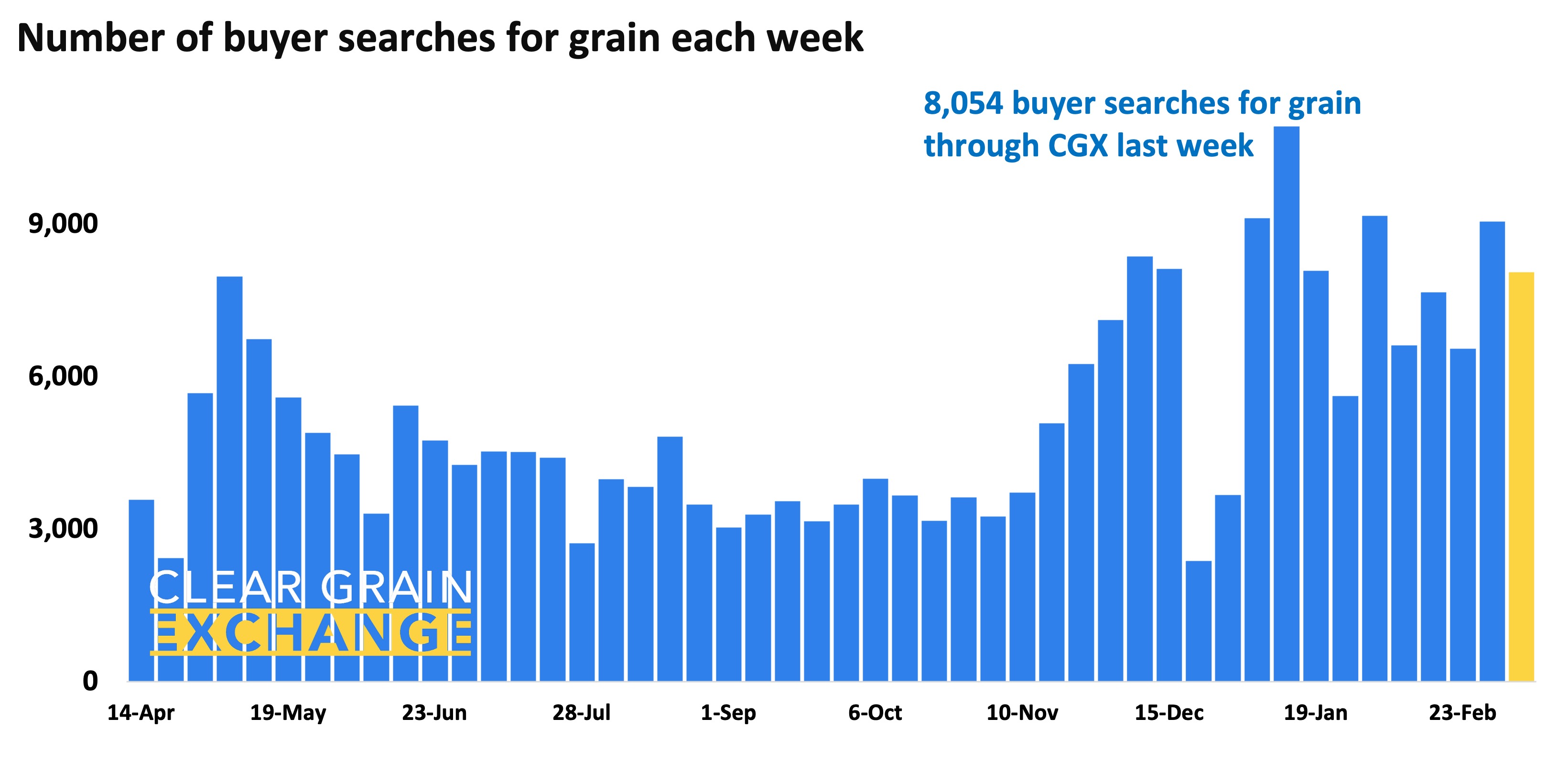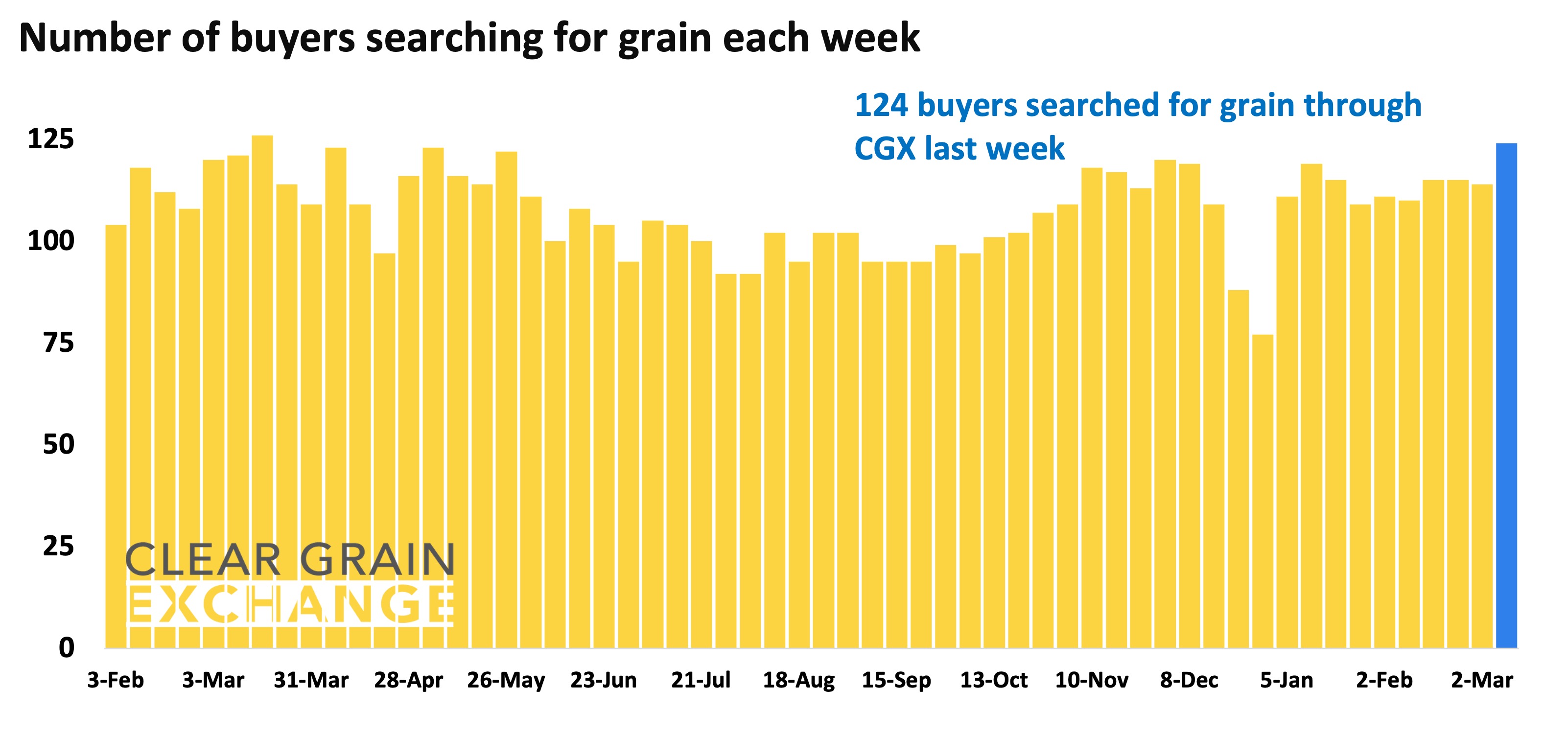 Growers setting grain prices - 124 buyers searched for grain offered for sale on CGX. 57 buyers were bidding for grain.