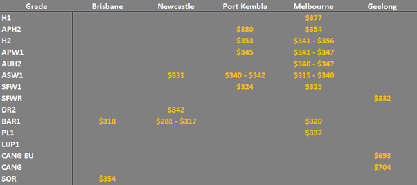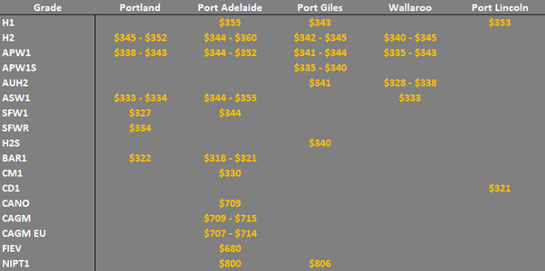 Note: GTA location differentials are used to convert prices to a port equivalent price, actual freight rates can differ particularly in the eastern states. You can offer any grade for sale to create demand.
