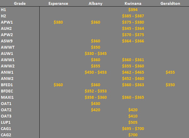 Feed barley was trading $363/t in WA versus $322/t eastern states ports indicating export demand is leading prices.