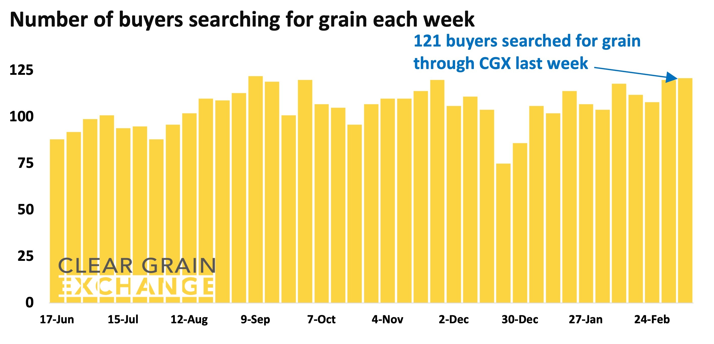 38 buyers purchased grain through CGX and igrainX, a total of 126 buyers made 6,012 searches for grain listed for sale on the exchange.