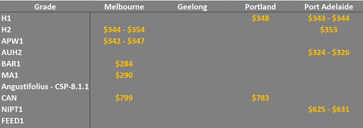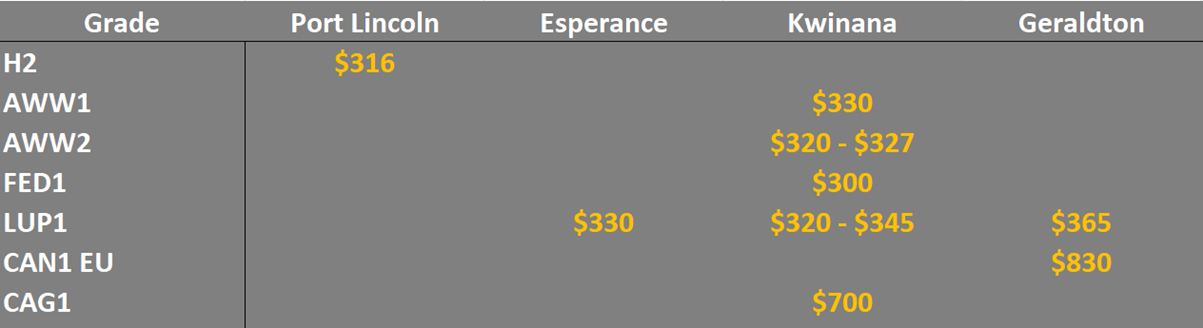 Note: GTA location differentials are used to convert prices to a port equivalent price, actual freight rates can differ particularly in the eastern states. You can offer any grade for sale to create demand.