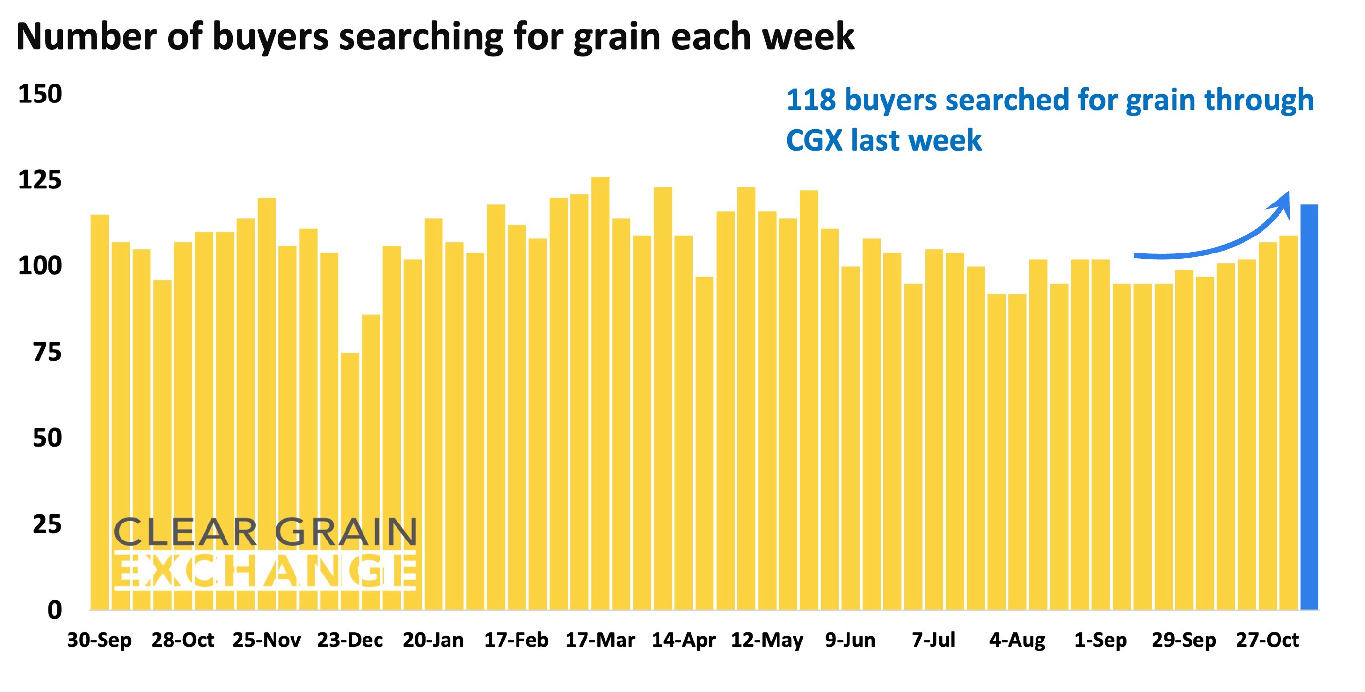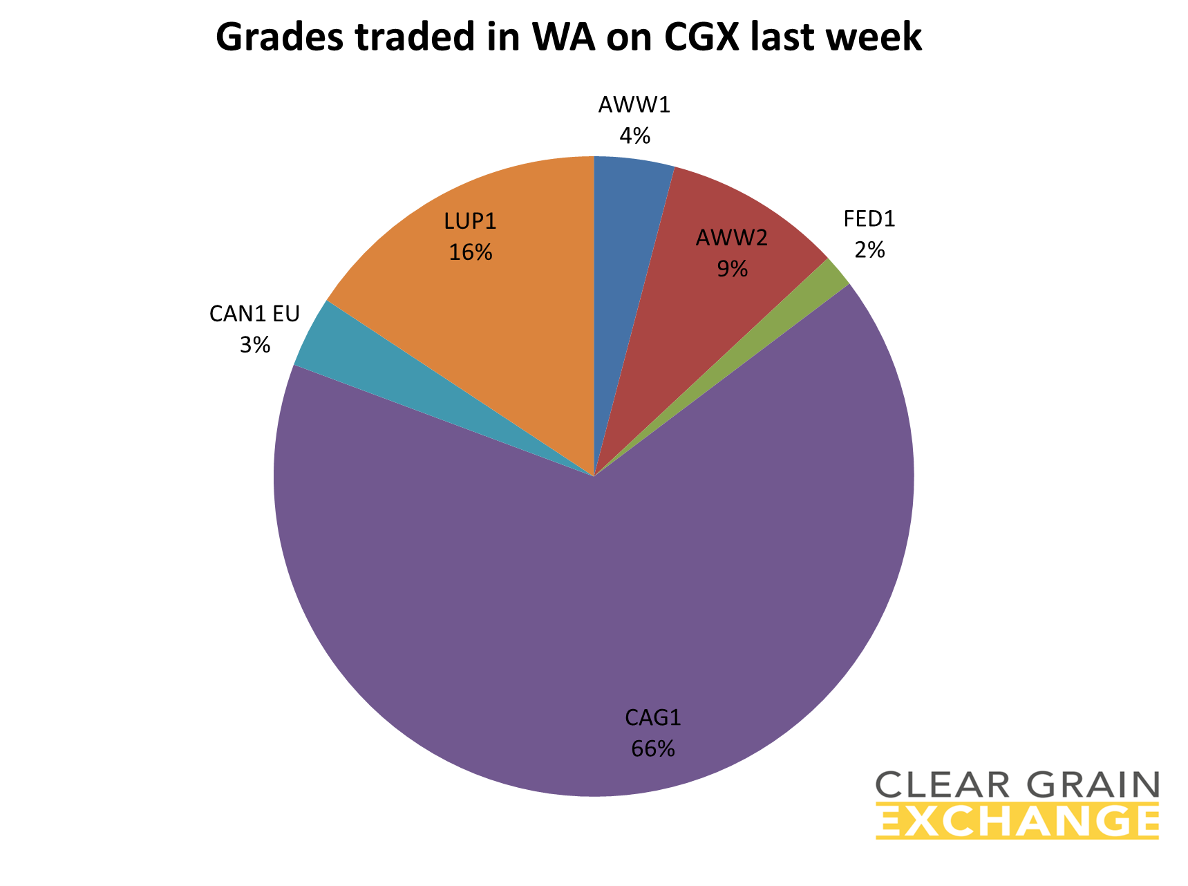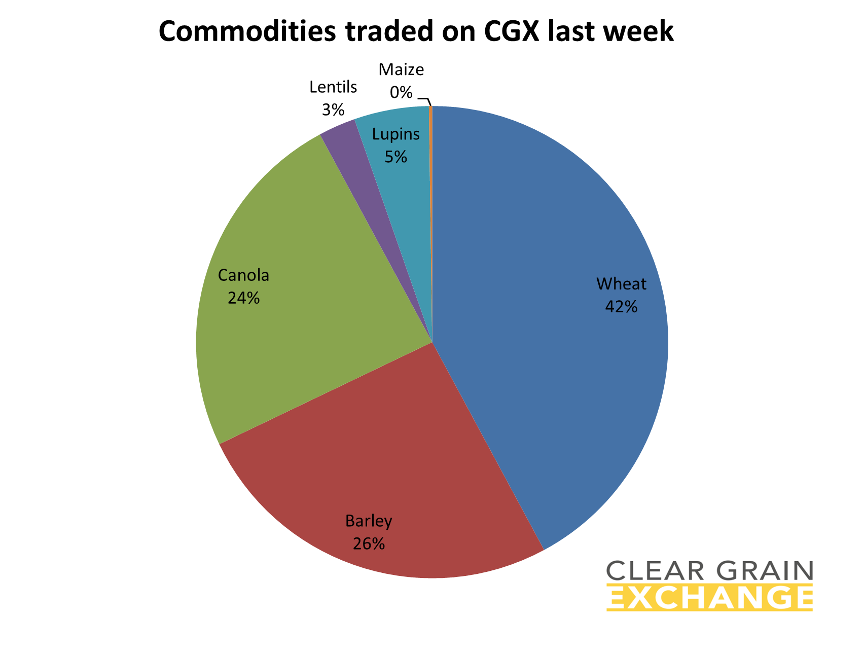 Last week 20 grades of wheat, barley, canola, lentils, lupins, and maize traded with 28 buyers purchasing and 35 buyers bidding for grain through Clear Grain Exchange (grain stored in warehouse) and igrainX (grain stored on-farm). 118 buyers made 3,721 searches for grain offered for sale.