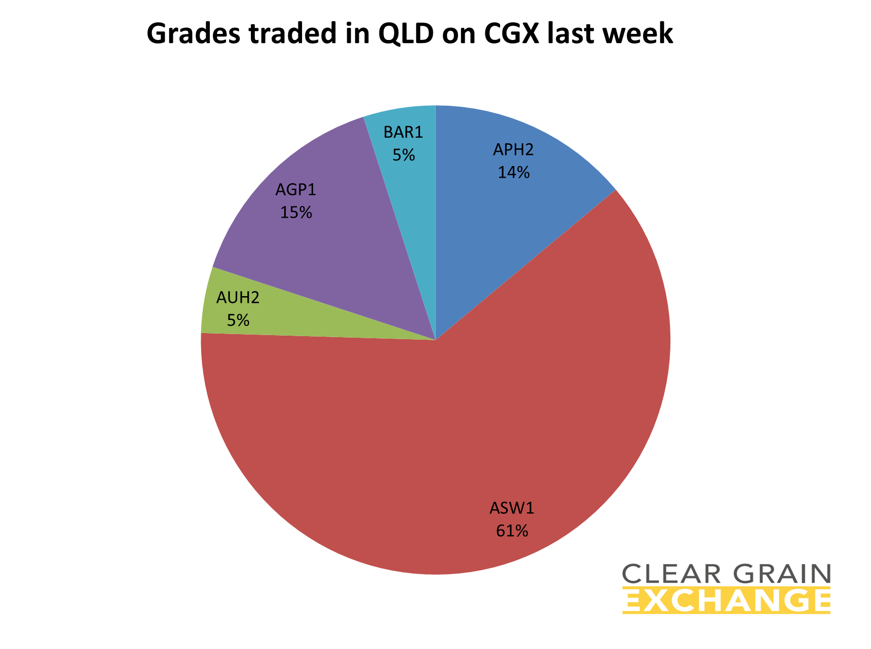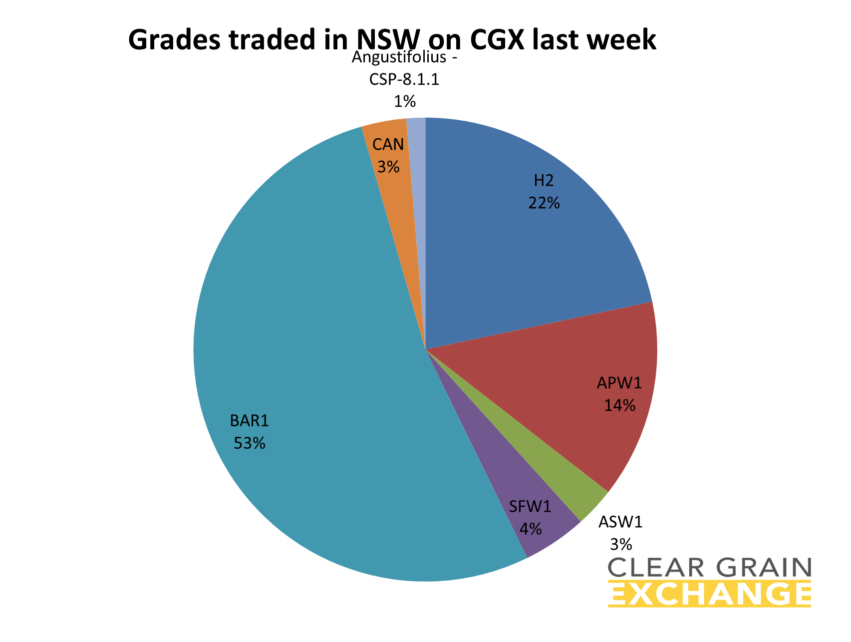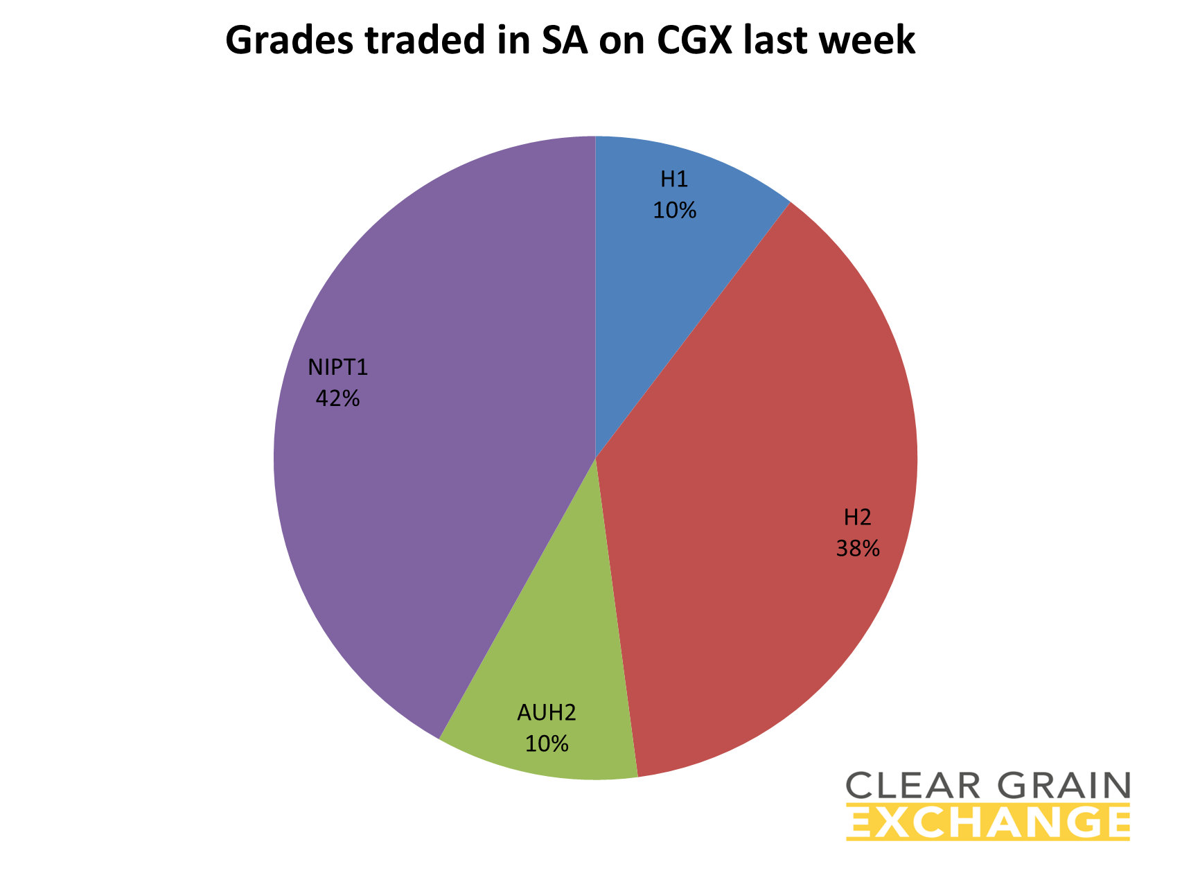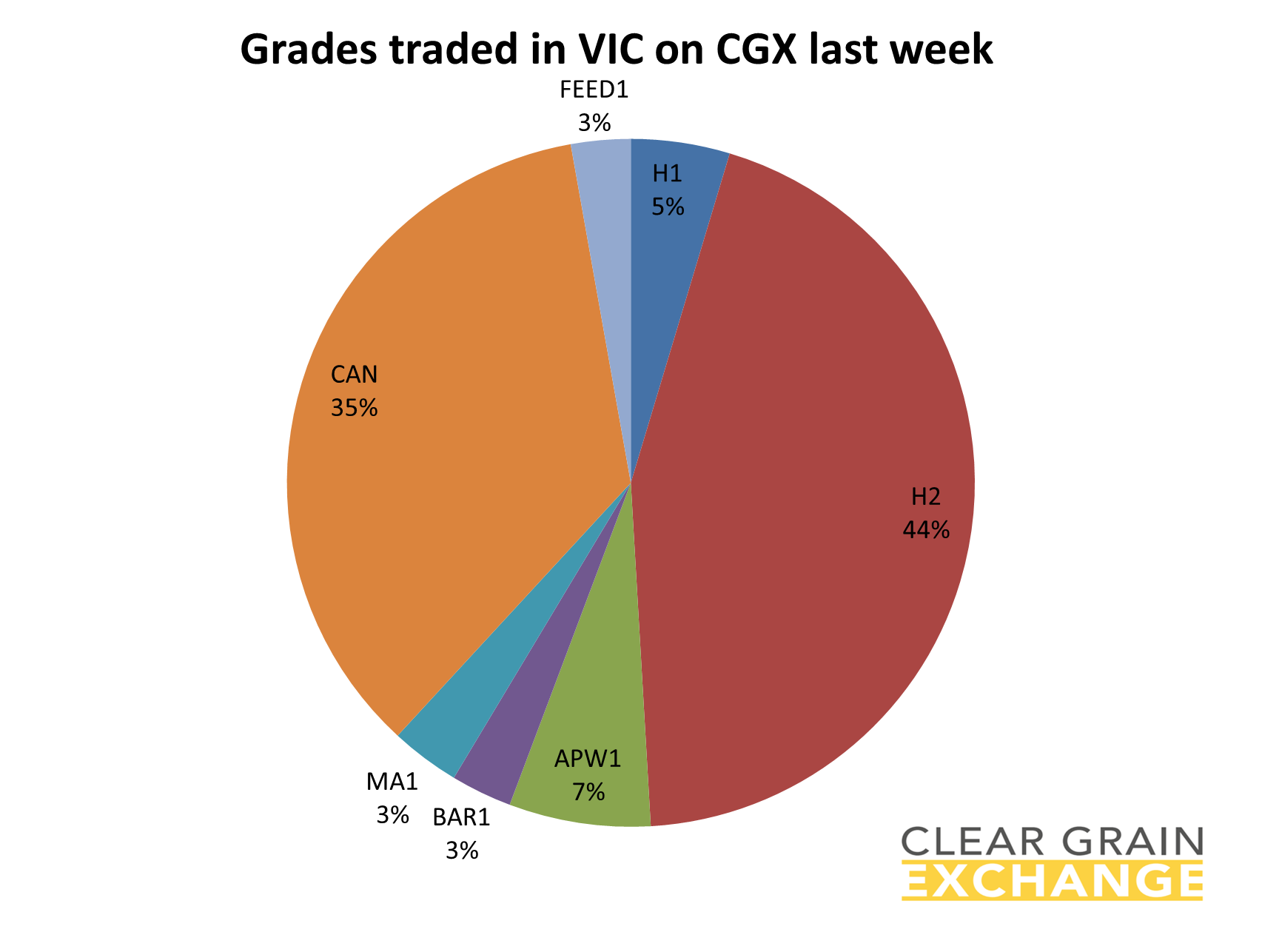 Last week 20 grades of wheat, barley, canola, lentils, lupins, and maize traded with 28 buyers purchasing and 35 buyers bidding for grain through Clear Grain Exchange (grain stored in warehouse) and igrainX (grain stored on-farm). 118 buyers made 3,721 searches for grain offered for sale.