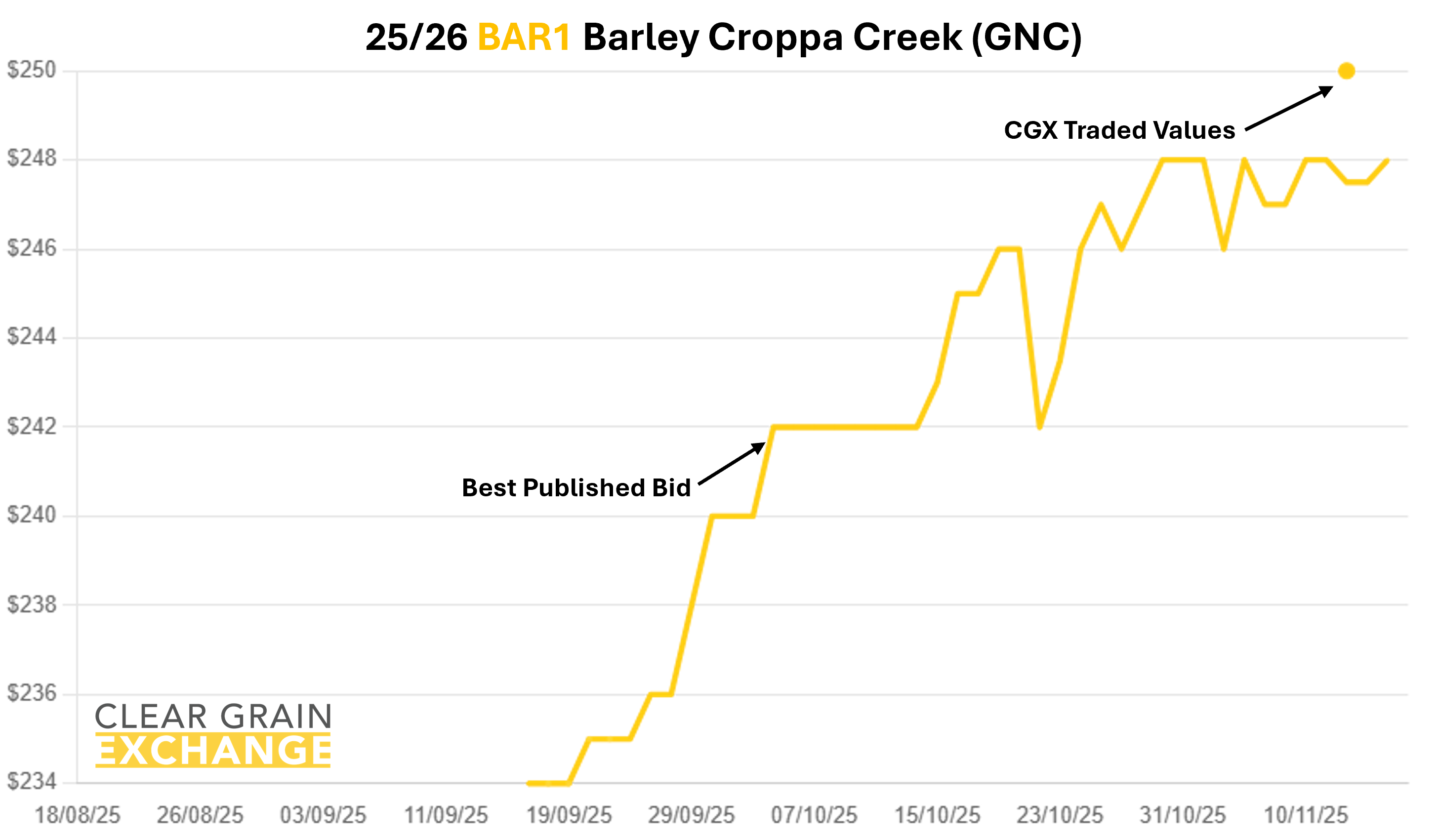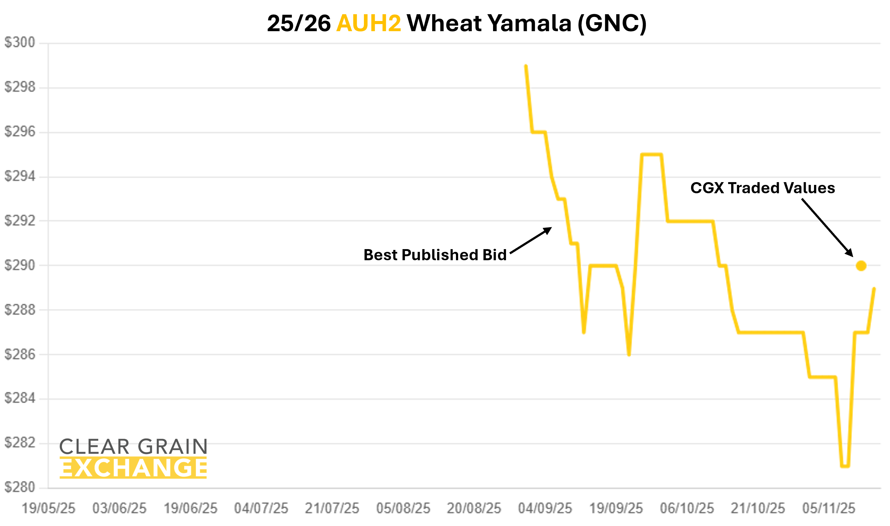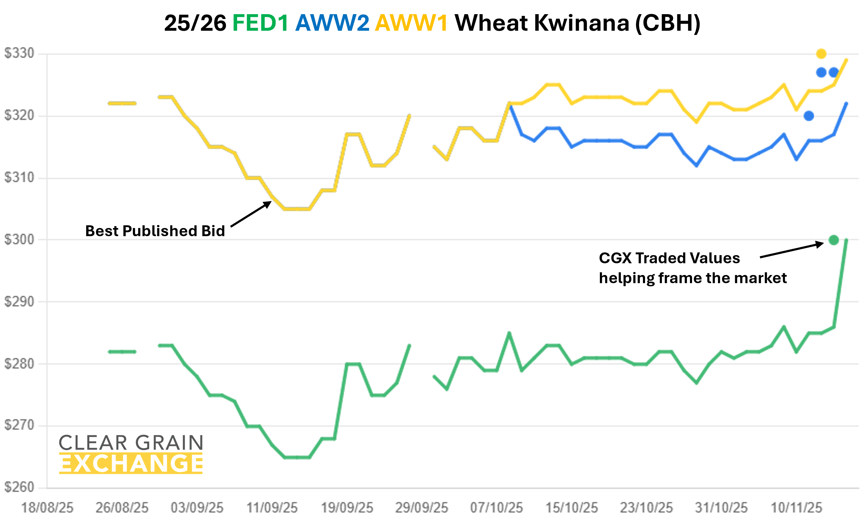 The prices traded through the exchange at a port track (eastern states) or FIS (in WA) level are provided below, but if you're reading this email you will have your own CGX account so login and use it to see what's trading, what's offered, and what's being bid at sites to help you determine the value of grain in your area.