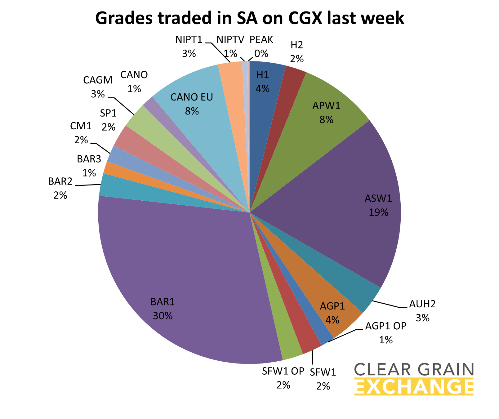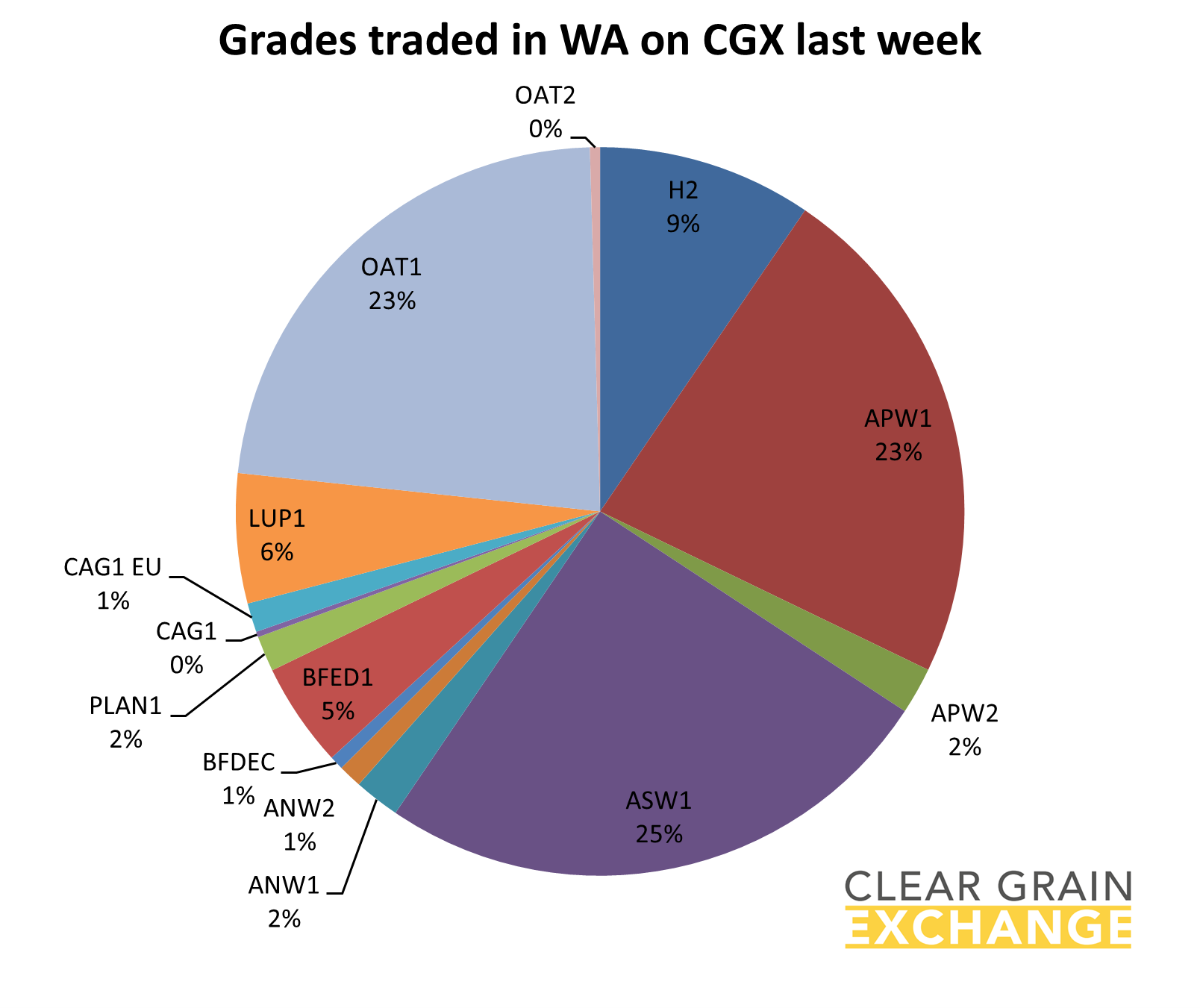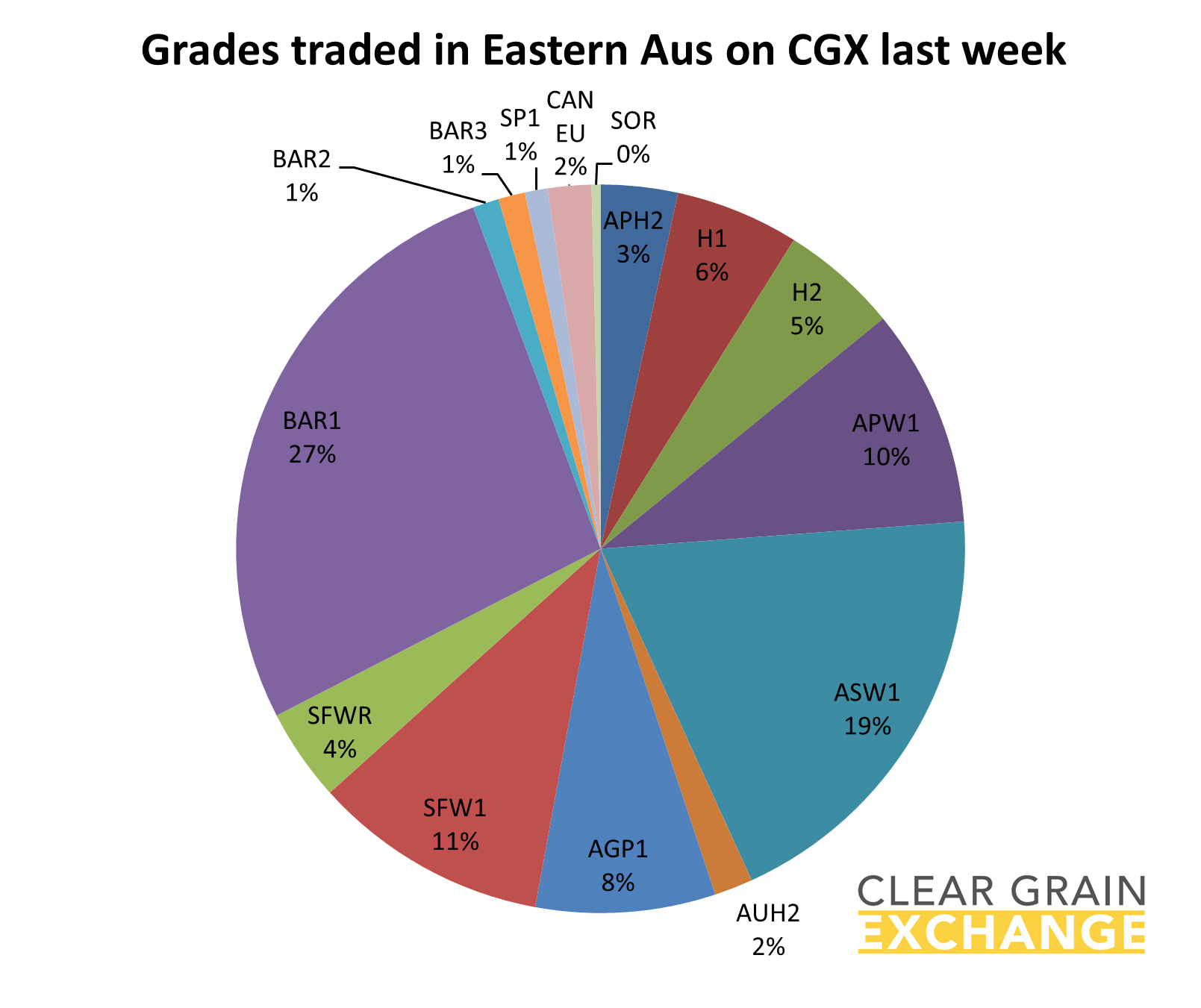 Demand for Australian grain remained robust through last week with 39 different buyers purchasing grain on Clear Grain Exchange and more searching grain offered for sale. The number of buyers each week has continued to climb over the last 4 weeks which can be an indicator of demand strengthening. The increased breadth of grades, commodities and locations trading is also an indicator of demand spreading across parcels of grain available for sale. CBOT wheat futures continued to climb through last week on the back of nervousness over northern hemisphere supply. Shorter weeks ahead in Australia due to Easter and ANZAC day public holidays may also have been an instigator of buyers wanting to get more active to secure grain. Demand is coming from traders, bulk exporters, container exporters and end users as the pull for available grain continues between higher paying international markets with supply chains working hard to get the grain off-shore, and domestic use. Wheat continues to be in demand in almost all locations across Australia with most grades attracting interest. 62% of all grain traded last week was wheat. The price differences across port zones continues to range significantly reflecting the localised supply and demand factors having a large impact on price such as quality and supply chain capacity. As a guide ASW1 traded $385/t FIS Kwinana, $430/t Geraldton, $410/t track Pt Adelaide and Pt Giles, $388/t Geelong and $373/t Newcastle. Higher protein milling grades continue to attract significant premiums over ASW1, while the spread to lower grades such as AGP1 and SFW1 is quite tight in many cases (ie. zero to $10/t). Barley continues to trade with South Australia continuing to lead the charge in price. Pt Adelaide and Pt Lincoln traded $400/t port, while Brisbane and Geelong were $365-368/t levels and Kwinana $344/t FIS. Oats and lupins saw a flurry of demand in the west with OAT1 trading $295/t FIS in Kwinana and Albany, Lupins traded $346/t Kwinana. All canola grades are still getting good interest over $1,000/t + oil bonifications when it's offered. Lentils, peas and sorghum were also strongly bid when offered for sale. The only way you can make sure you get access to the demand for your grain is to offer it for sale at values you deem fair value, or prices you are targeting to sell. This past week there were plenty of examples of growers grain selling at values they didn't realise were available. There are often many more buyers than you may realise that want your grain.