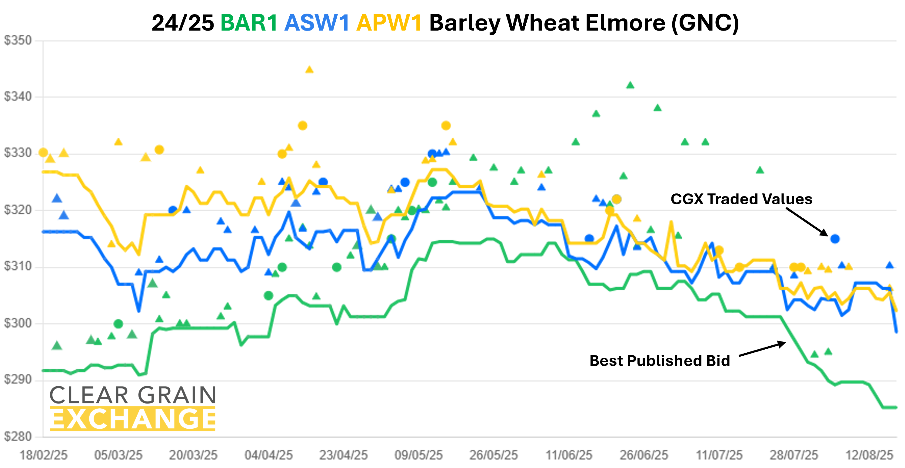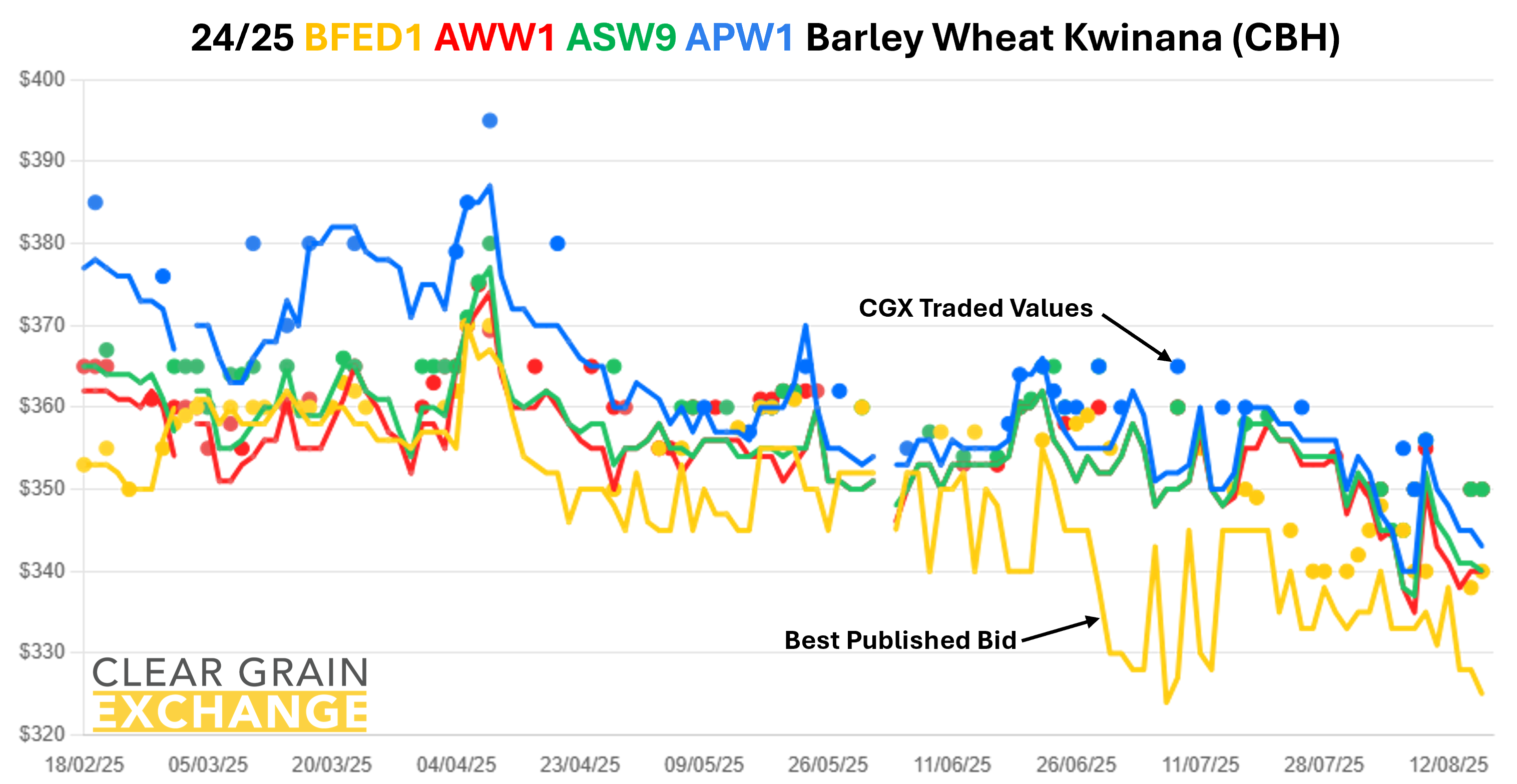 The prices traded through the exchange at a port track or FIS (in WA) level are provided below, but if you're reading this email you will have your own CGX account so login and use it to see what's trading, what's offered, and what's being bid at sites to help you determine the value of grain in your area.