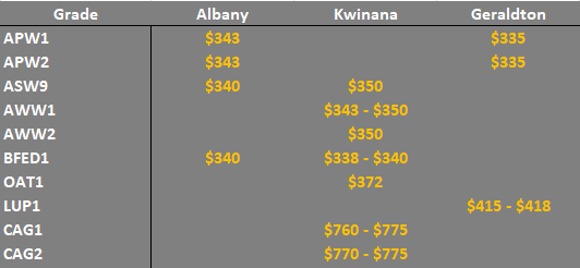Note: GTA location differentials are used to convert prices to a port equivalent price, actual freight rates can differ particularly in the eastern states. You can offer any grade for sale to create demand.