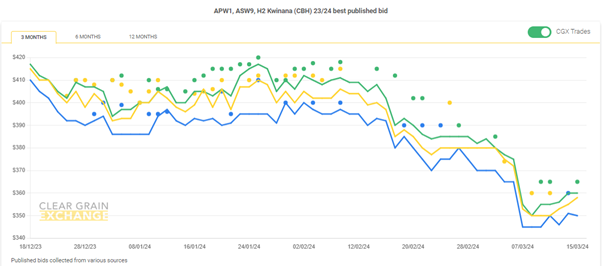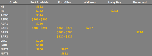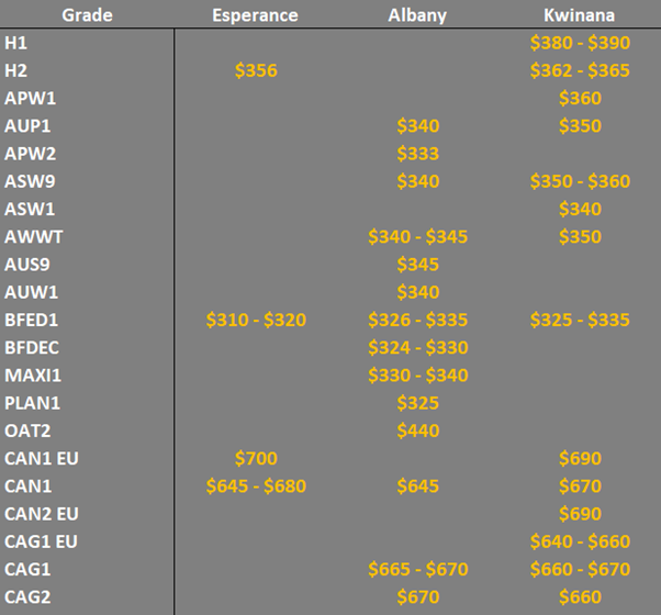 Note: GTA location differentials are used to convert prices to a port equivalent price, actual freight rates can differ particularly in the eastern states. You can offer any grade for sale to create demand.
