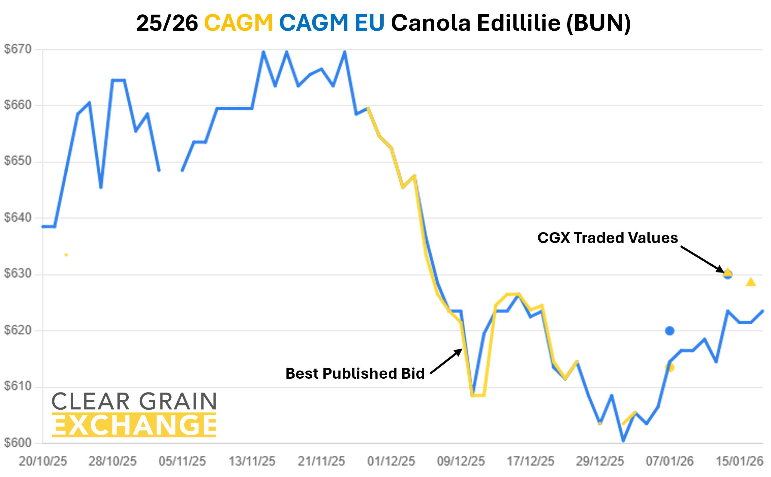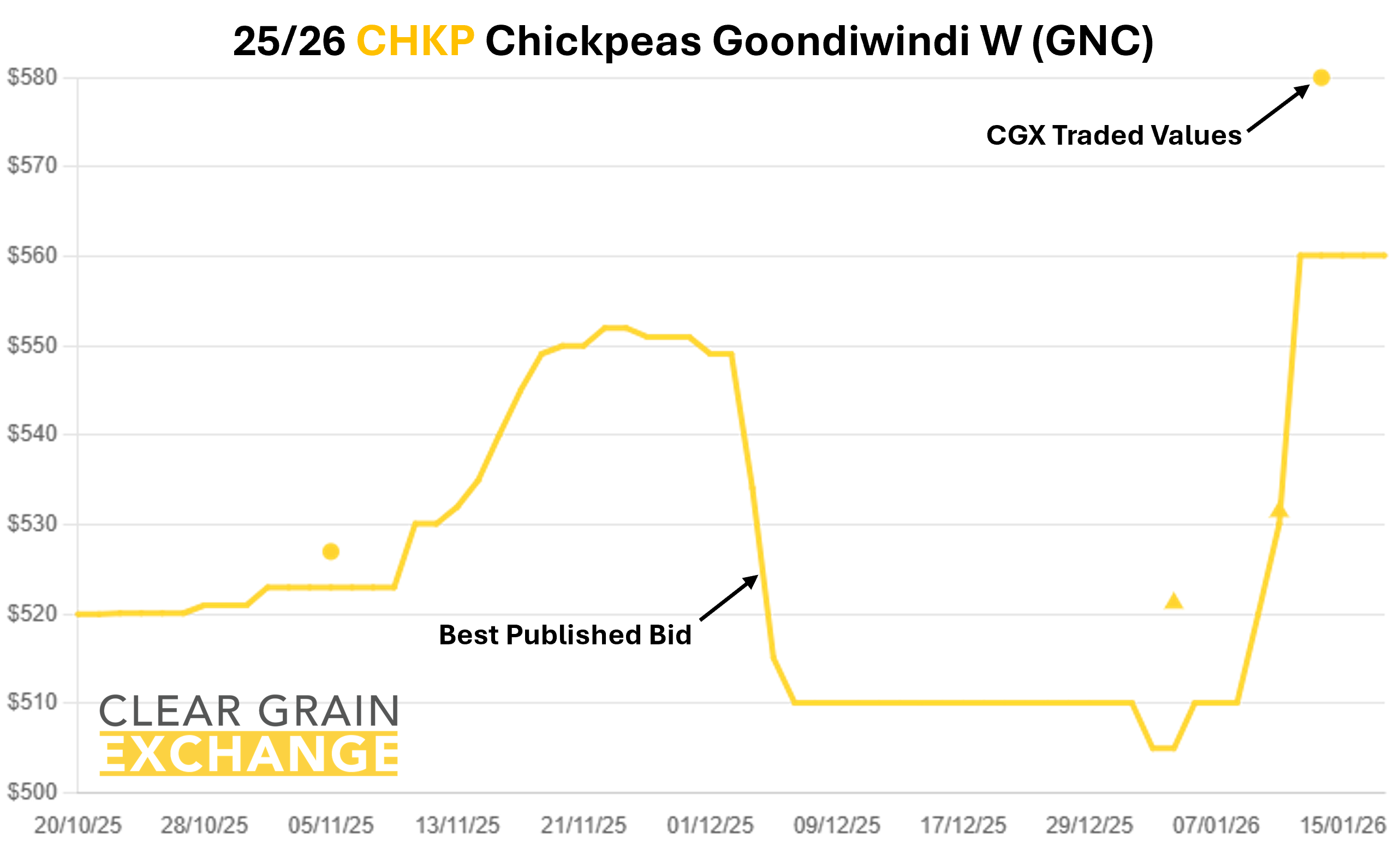 The prices traded through the exchange at a port track (eastern states) or FIS (in WA) level are provided below, but if you're reading this email you will have your own CGX account so login and use it to see what's trading, what's offered, and what's being bid at sites to help you determine the value of grain in your area.