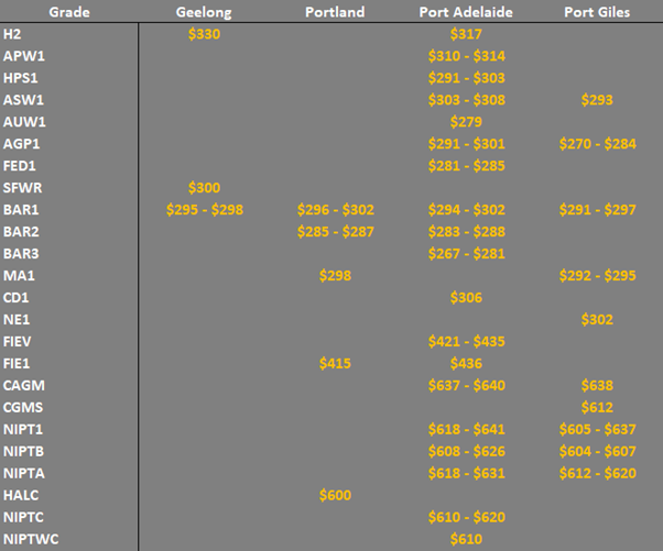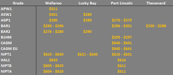 Note: GTA location differentials are used to convert prices to a port equivalent price, actual freight rates can differ particularly in the eastern states. You can offer any grade for sale to create demand.