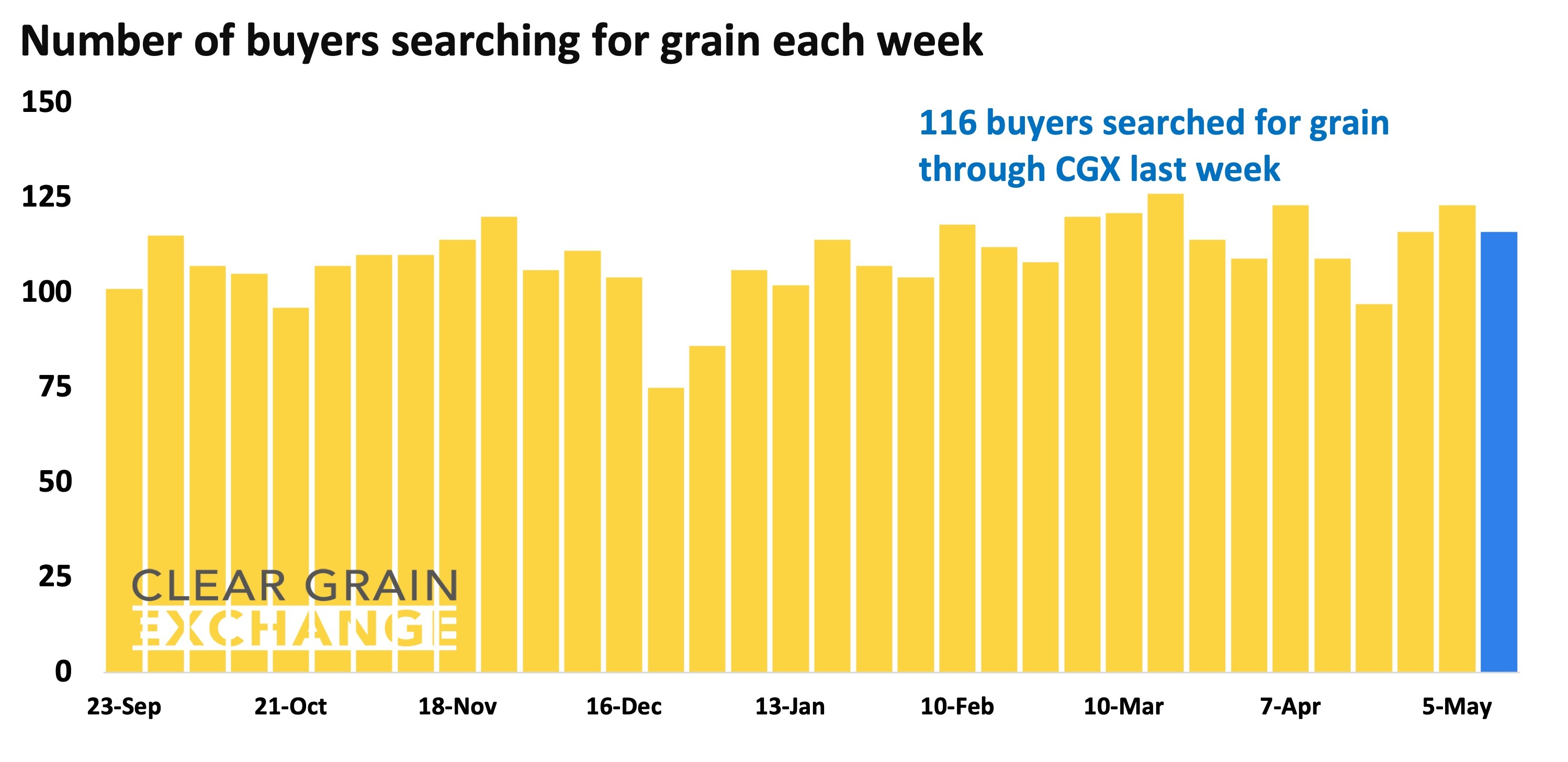 Plenty of buyers are looking for grain with 64 buyers bidding for grain last week and 116 buyers made 6,740 searches for grain listed for sale on Clear Grain Exchange and igrainX.