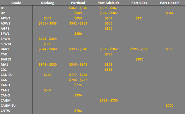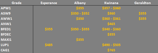 Note: GTA location differentials are used to convert prices to a port equivalent price, actual freight rates can differ particularly in the eastern states. You can offer any grade for sale to create demand.