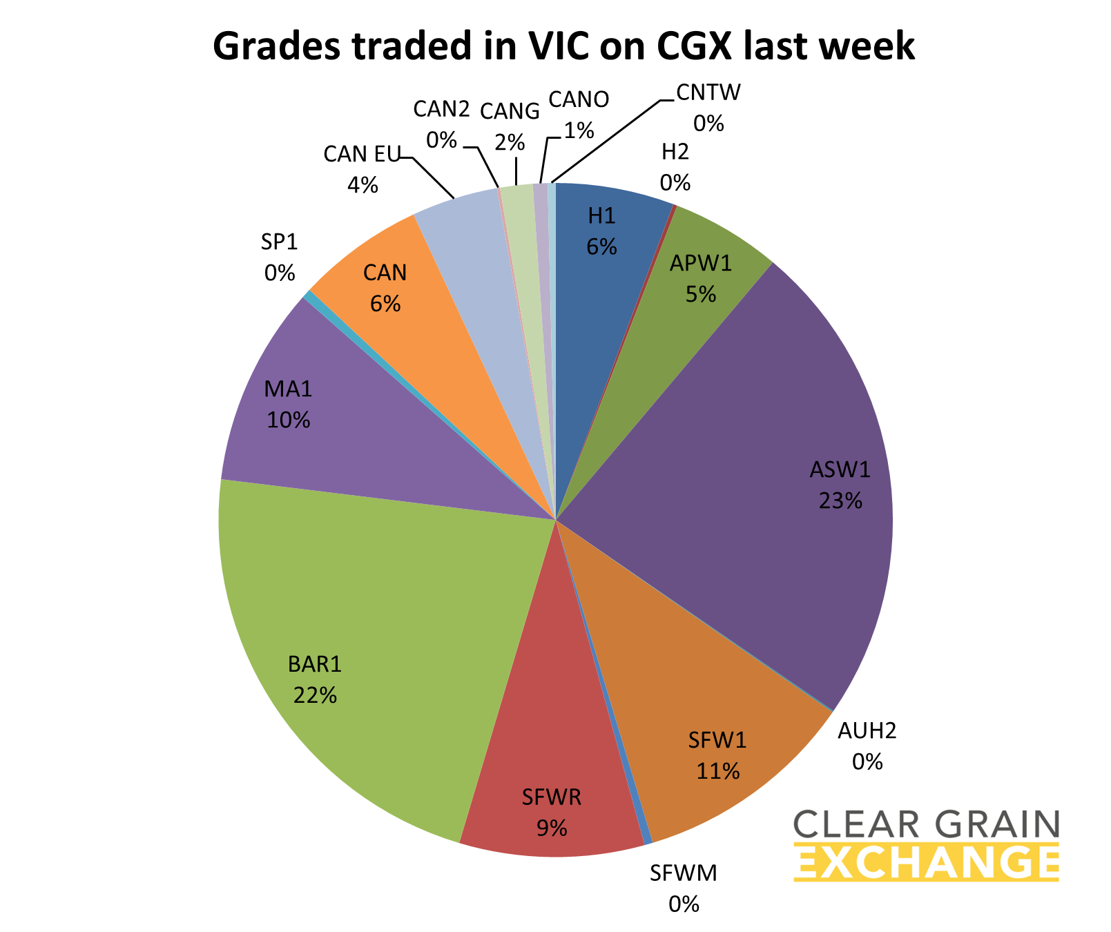 54 buyers met grower offer prices to purchase 34 grades - Wheat, barley, canola, chickpeas, lupins, and sorghum traded in 14 port zones.