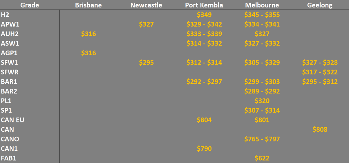 Note: GTA location differentials are used to convert prices to a port equivalent price, actual freight rates can differ particularly in the eastern states. You can offer any grade for sale to create demand.