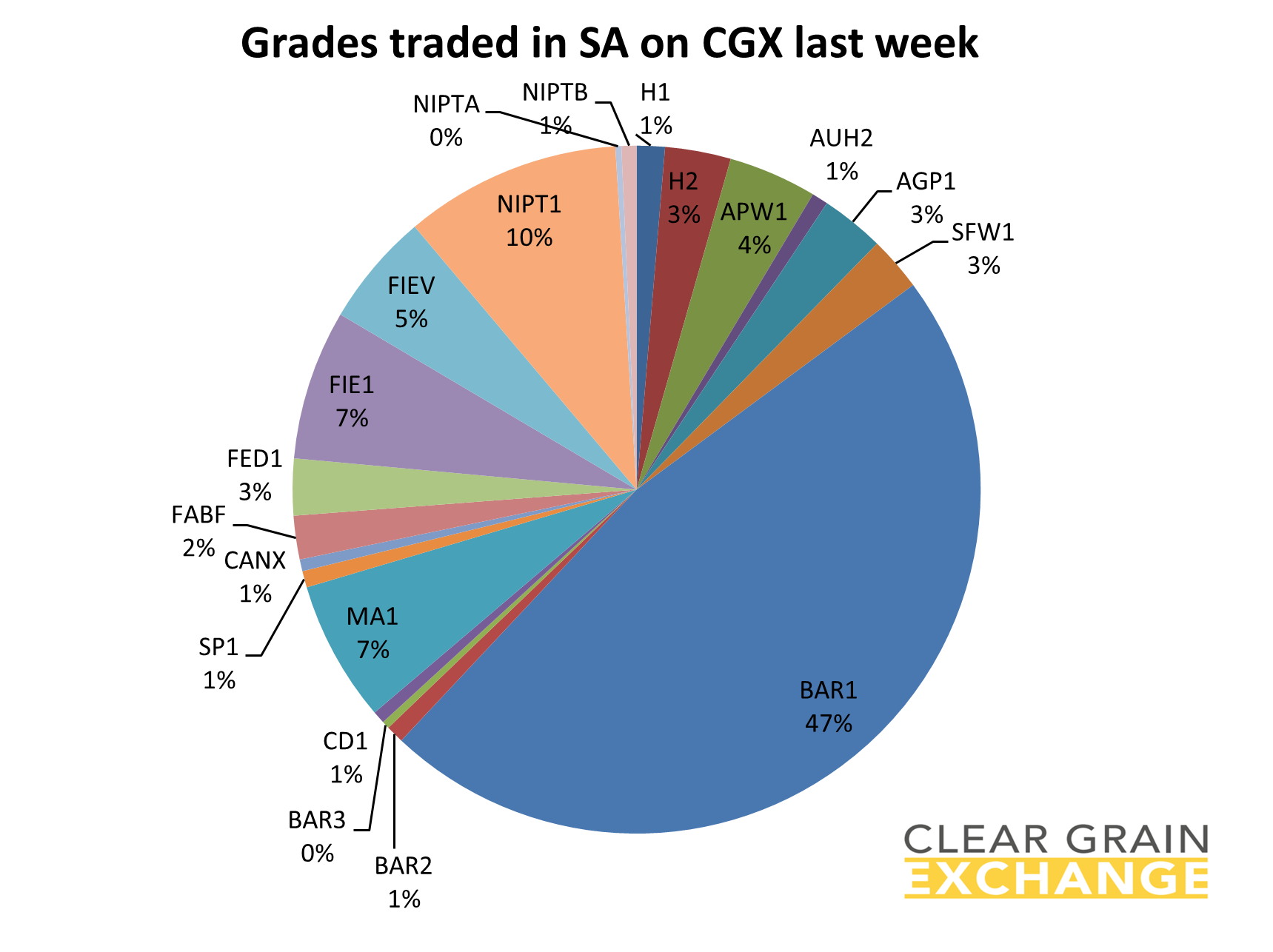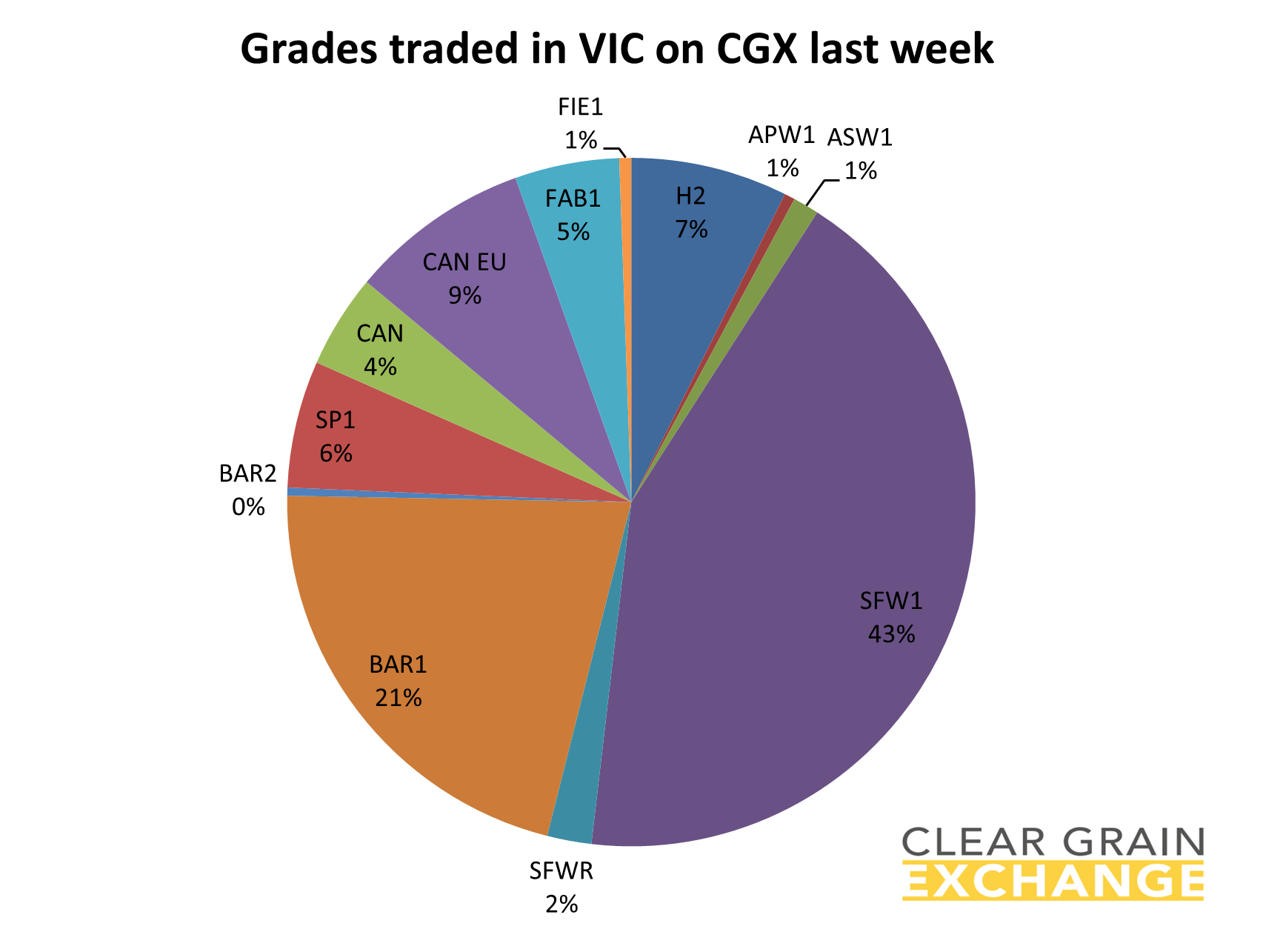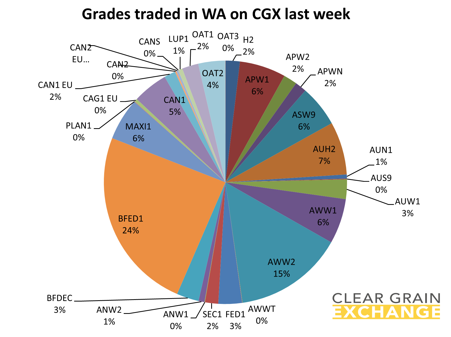 Last week 21 grades of wheat traded through Clear Grain Exchange (CGX) making up 54% of all grain traded. 33 different buyers bought those wheat grades with more searching and bidding for wheat offered for sale all around Australia.