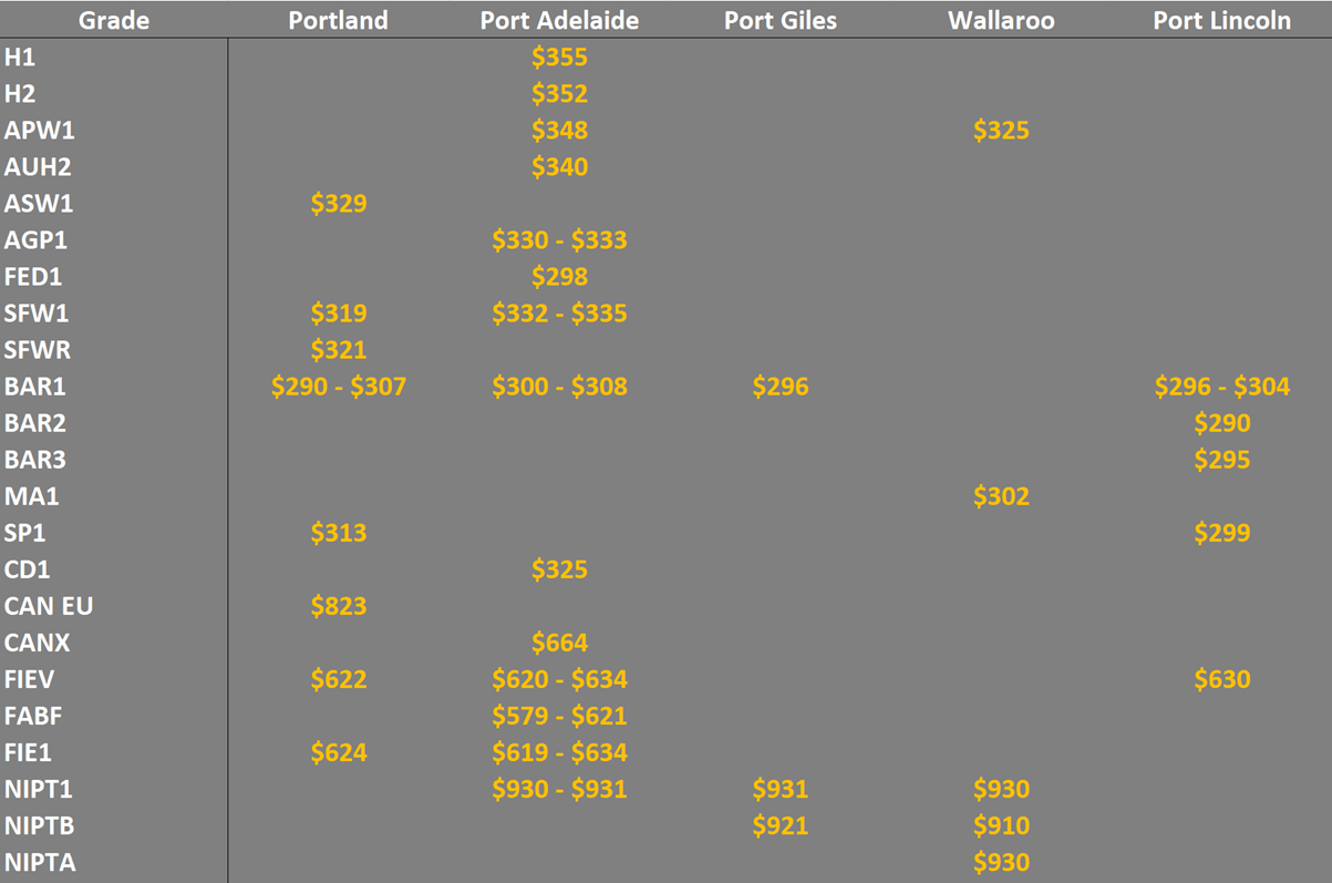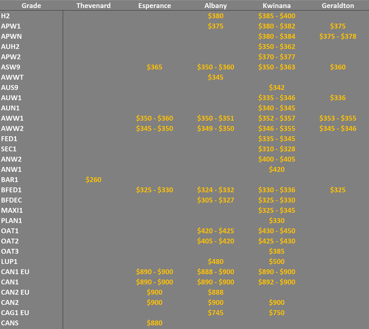 49 buyers met grower offer prices to purchase 53 grades - Wheat, barley, canola, faba beans, lentils, lupins, and oats traded in 15 port zones.