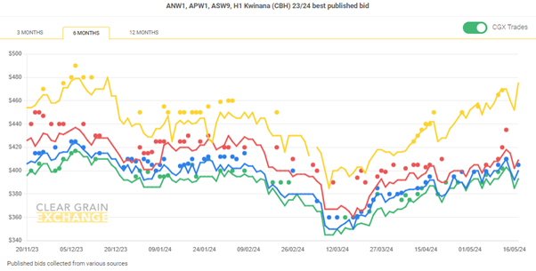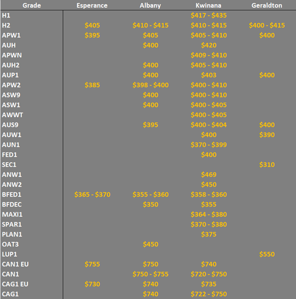 Note: GTA location differentials are used to convert prices to a port equivalent price, actual freight rates can differ particularly in the eastern states. You can offer any grade for sale to create demand.