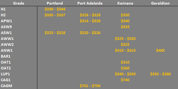 Note: GTA location differentials are used to convert prices to a port equivalent price, actual freight rates can differ particularly in the eastern states. You can offer any grade for sale to create demand.