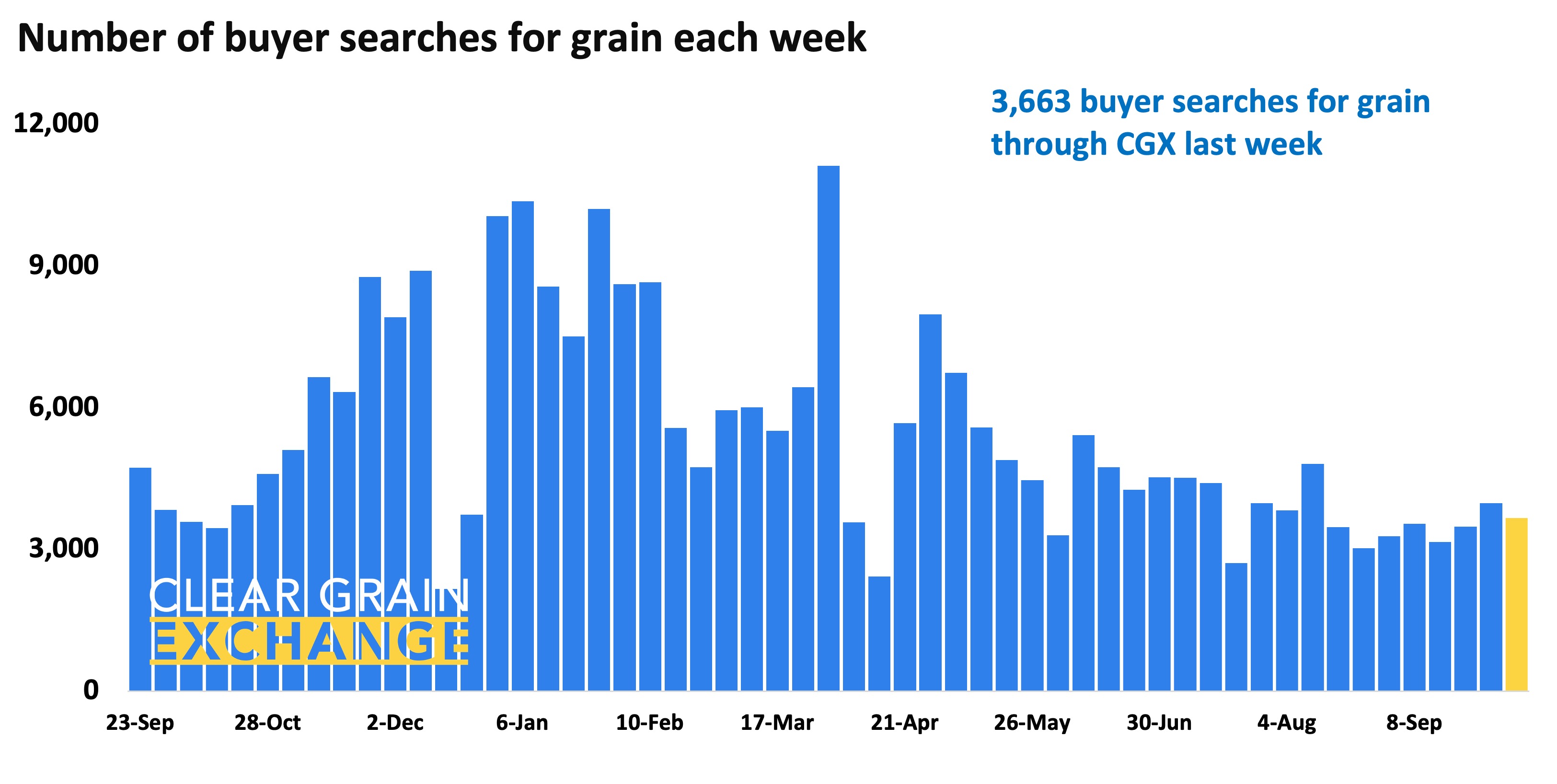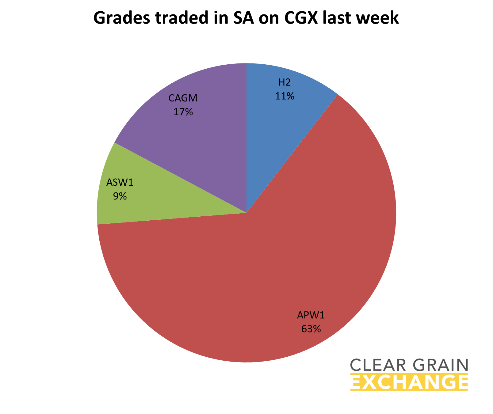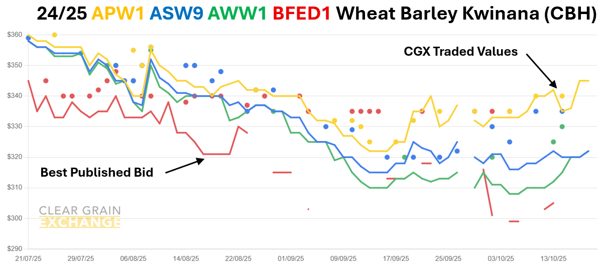 Traded prices through Clear Grain Exchange that had corresponding published bids last week averaged $23.07/t above best published bids advertised from buyers.