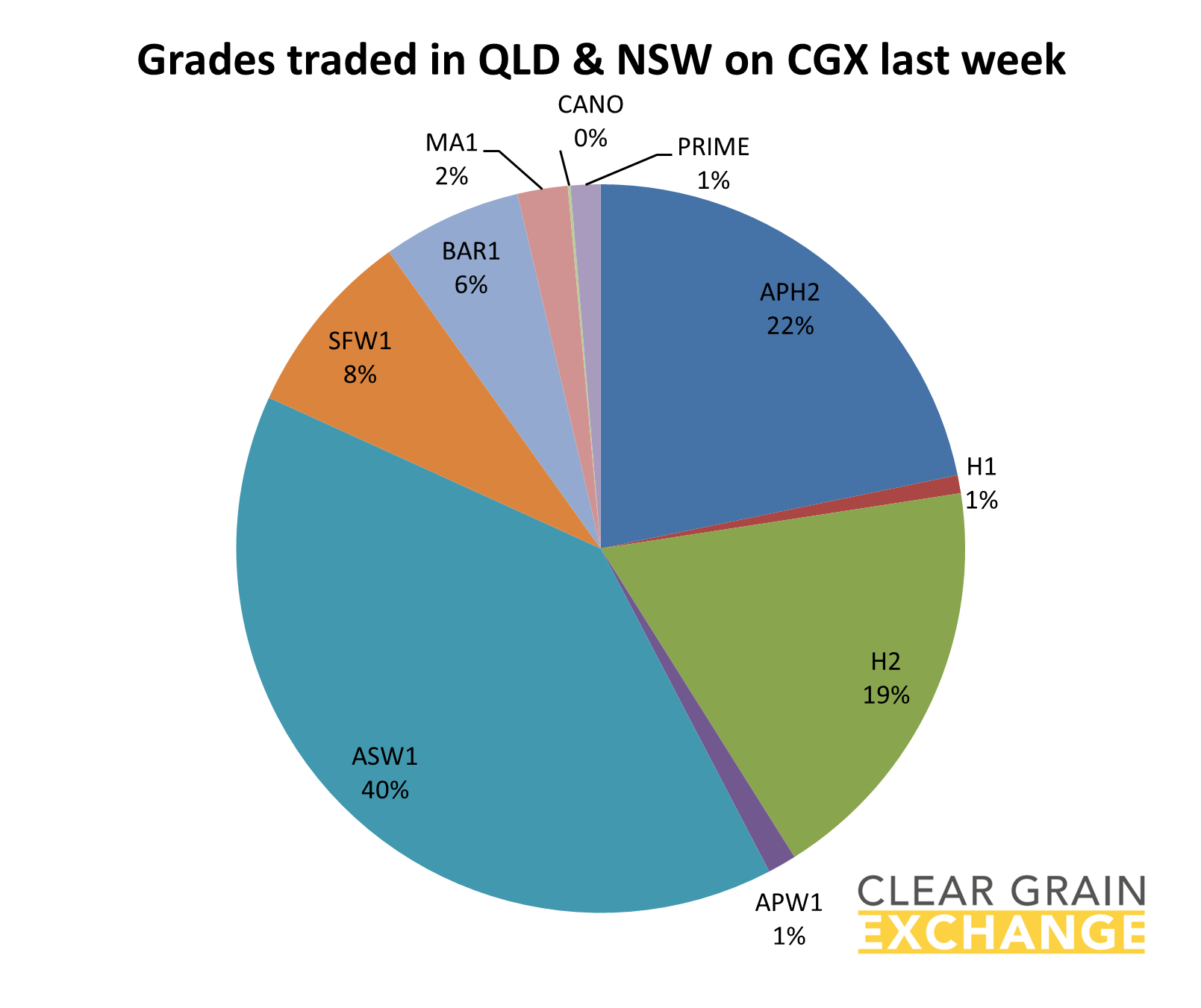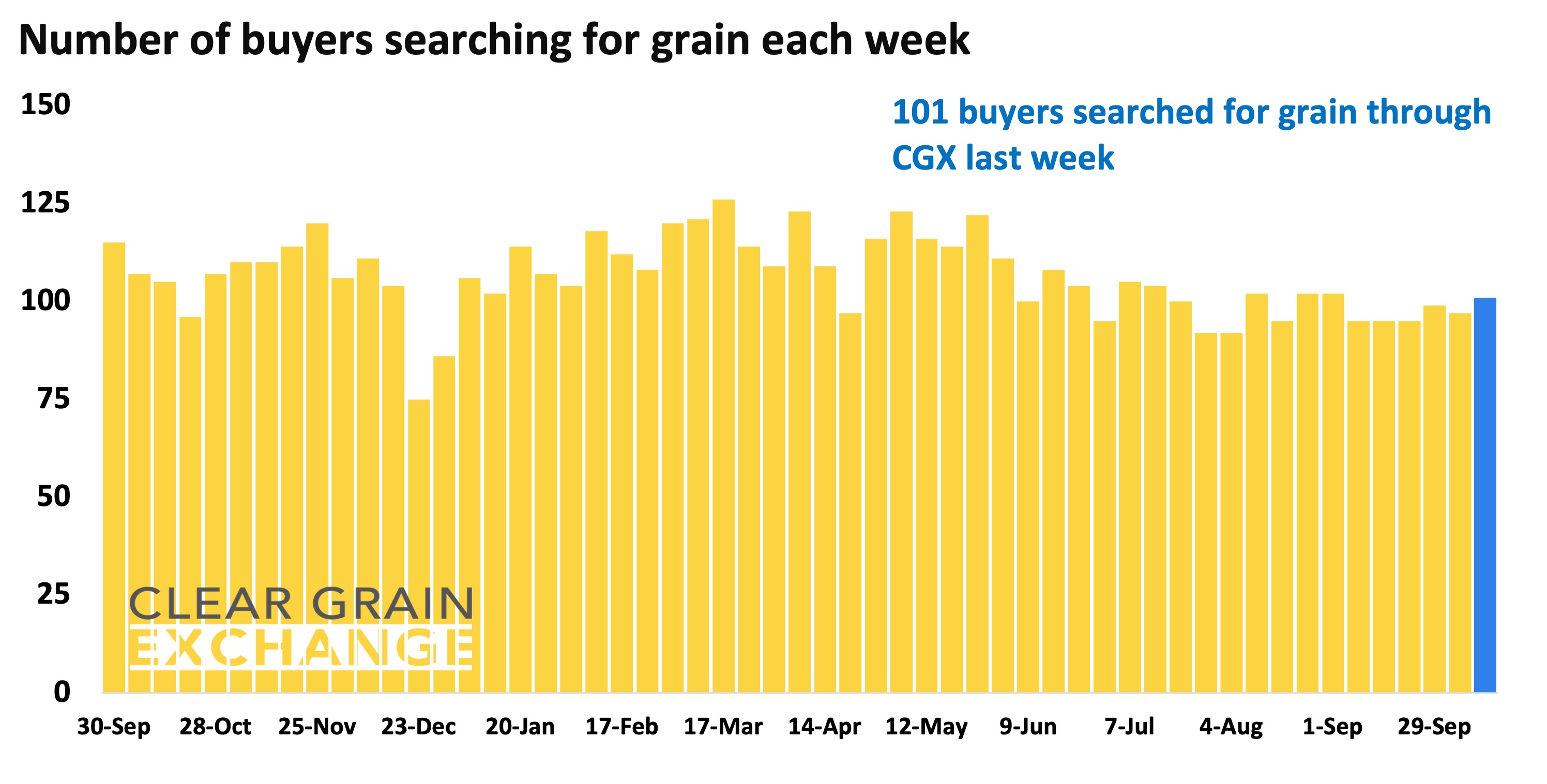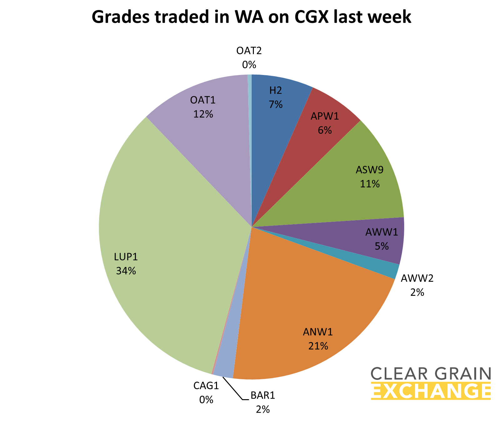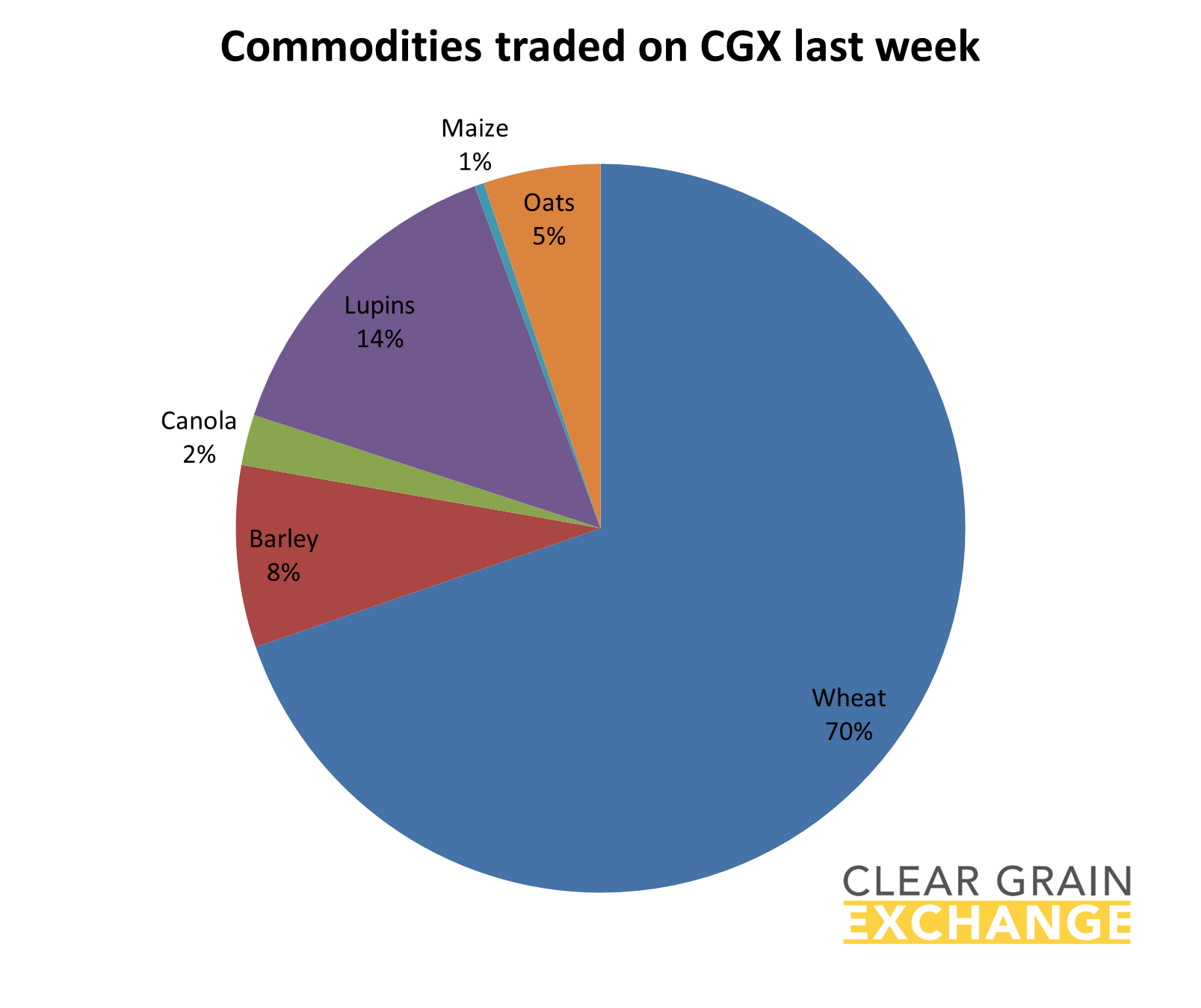 Last week 20 grades of wheat, barley, canola, lupins, maize and oats traded with 27 buyers purchasing and 38 buyers bidding for grain. 101 buyers made 3,663 searches for grain offered for sale.