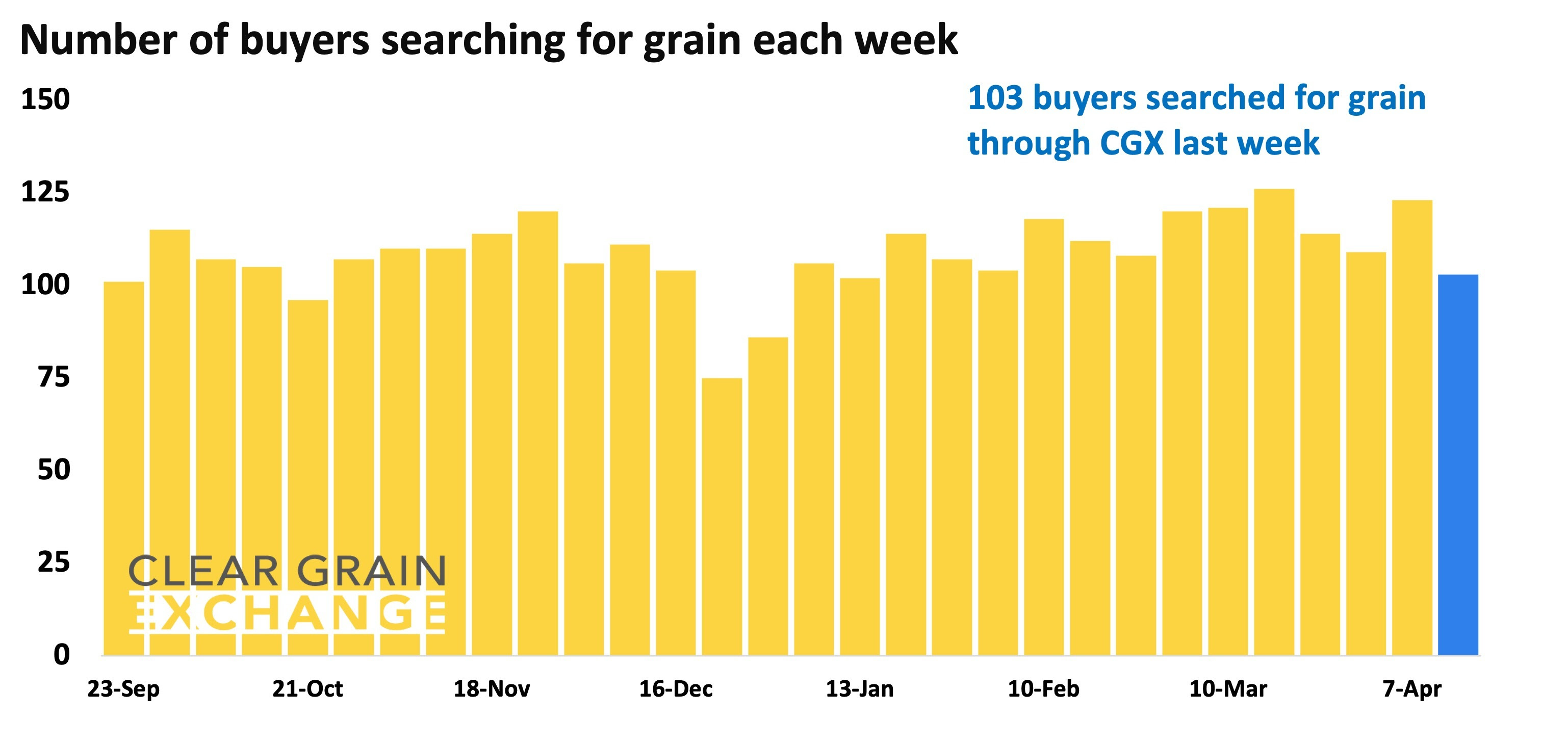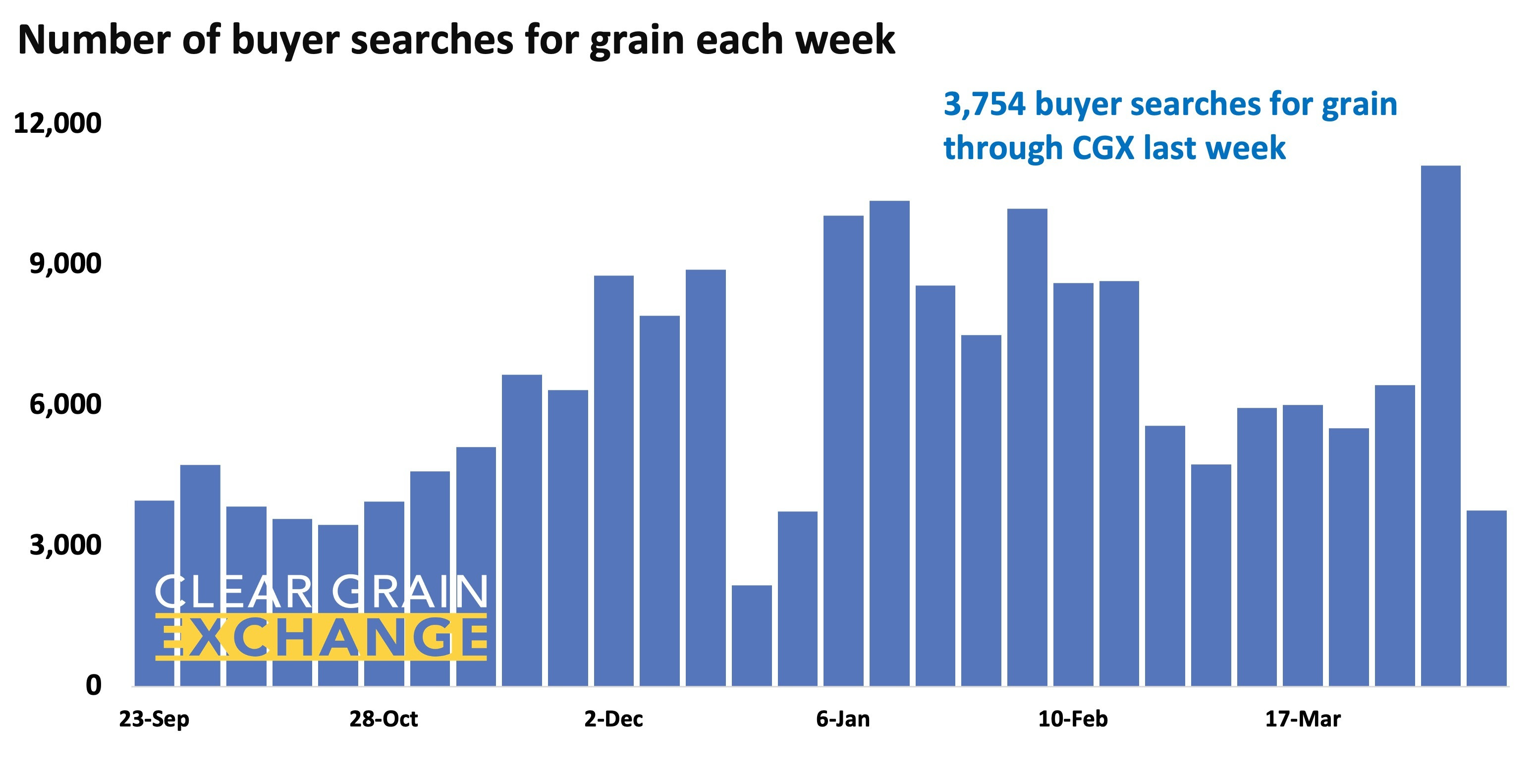 29 buyers bid up to match grower offer prices and purchase grain. 42 buyers bid for grain and a total of 103 buyers made 3,754 searches for grain listed for sale on the exchange.