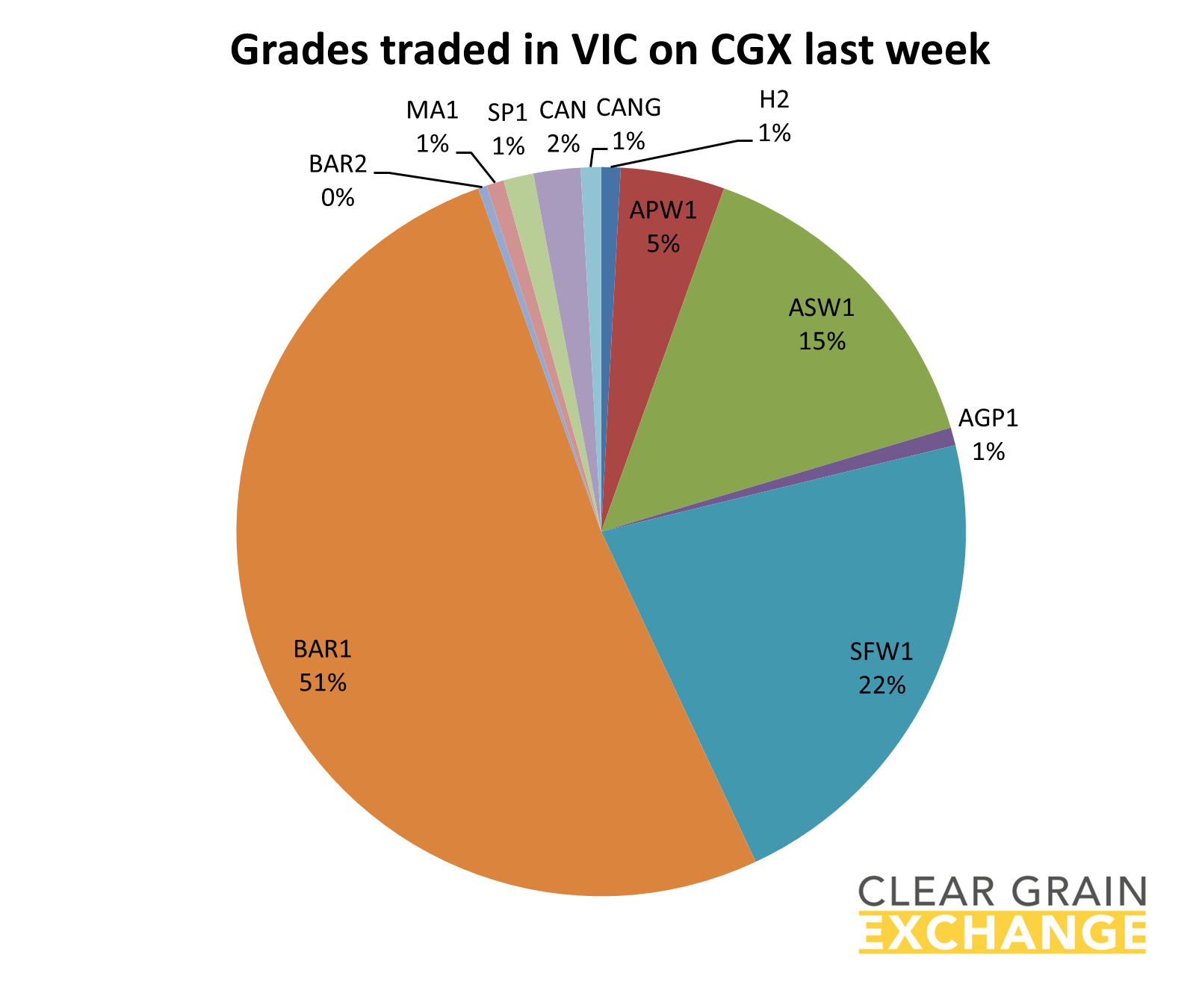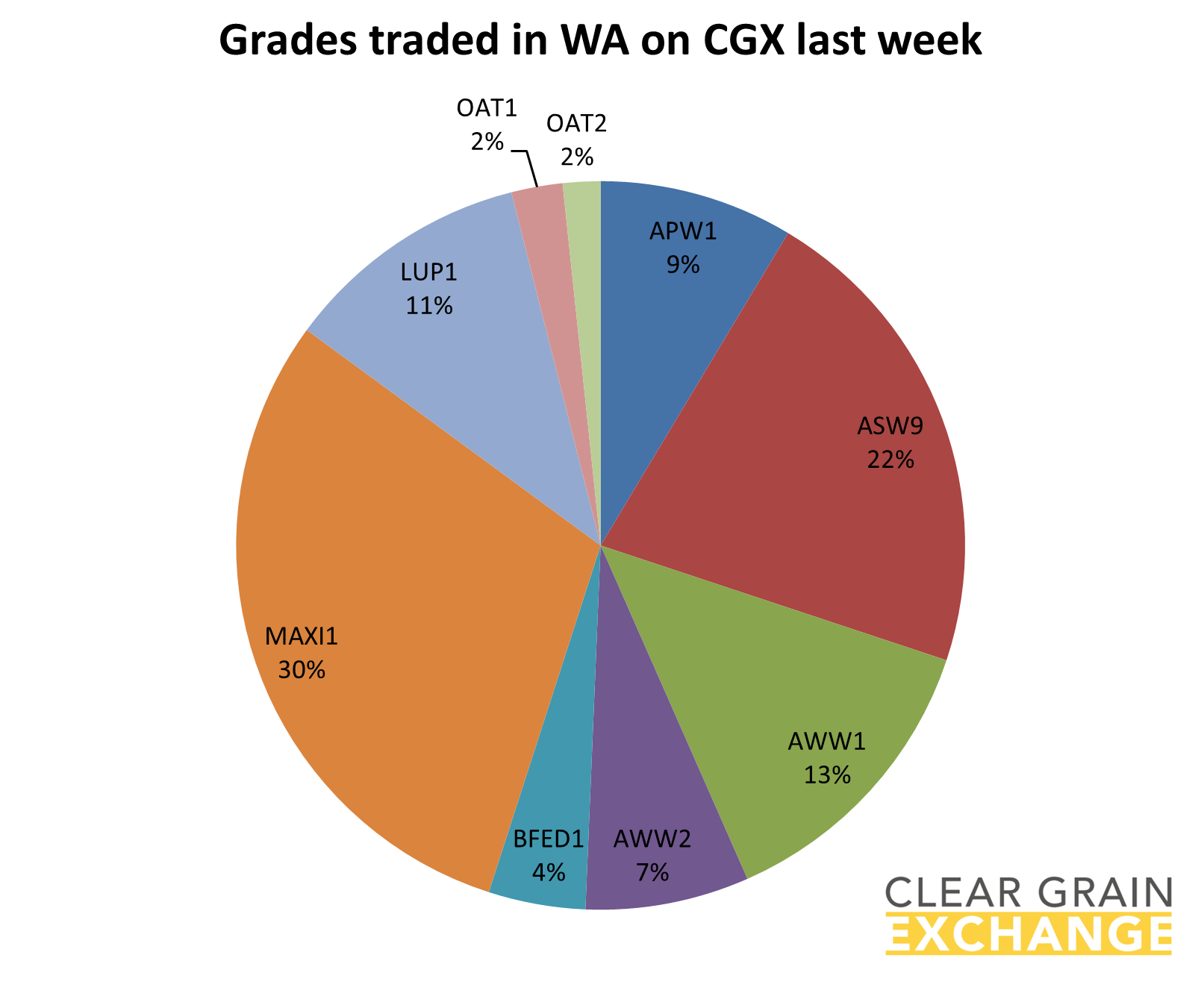 29 buyers met grower offer prices to purchase 27 grades - Wheat, barley, canola, chickpeas, faba beans, lupins, and oats traded in 11 port zones.