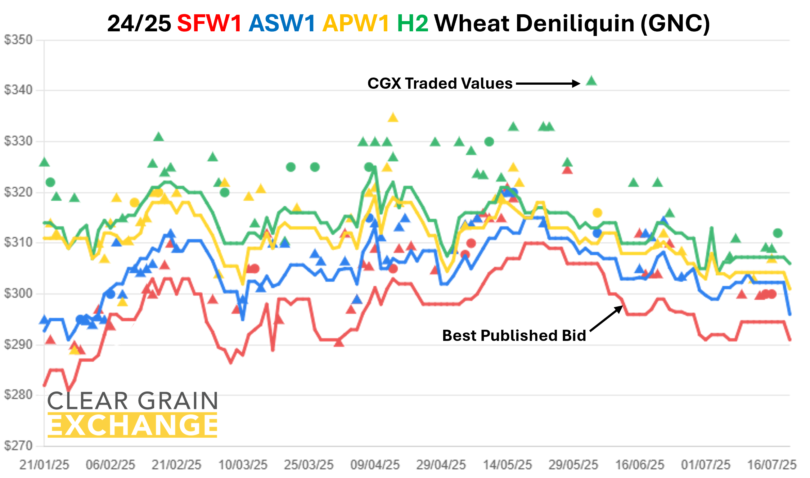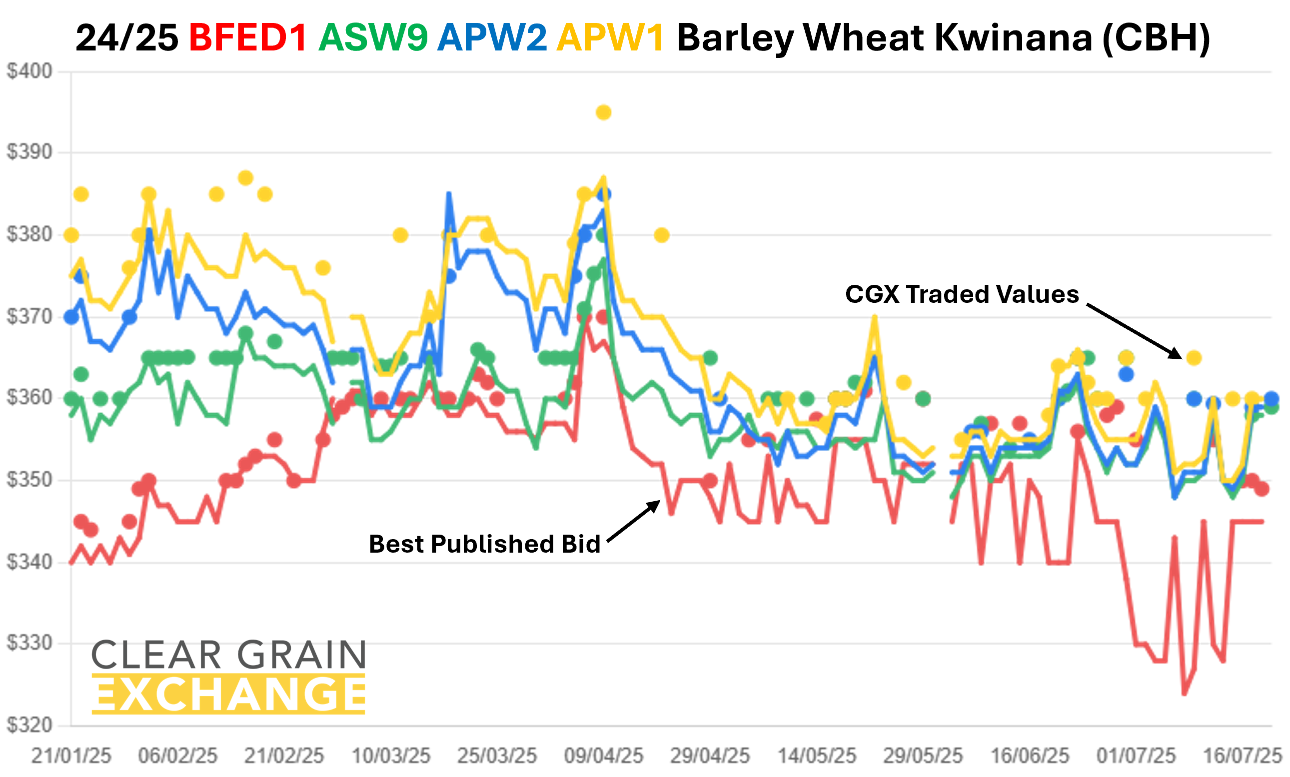 The prices traded through the exchange at a port track or FIS (in WA) level are provided below, but if you're reading this email you will have your own CGX account so login and use it to see what's trading, what's offered, and what's being bid at sites to help you determine the value of grain in your area.