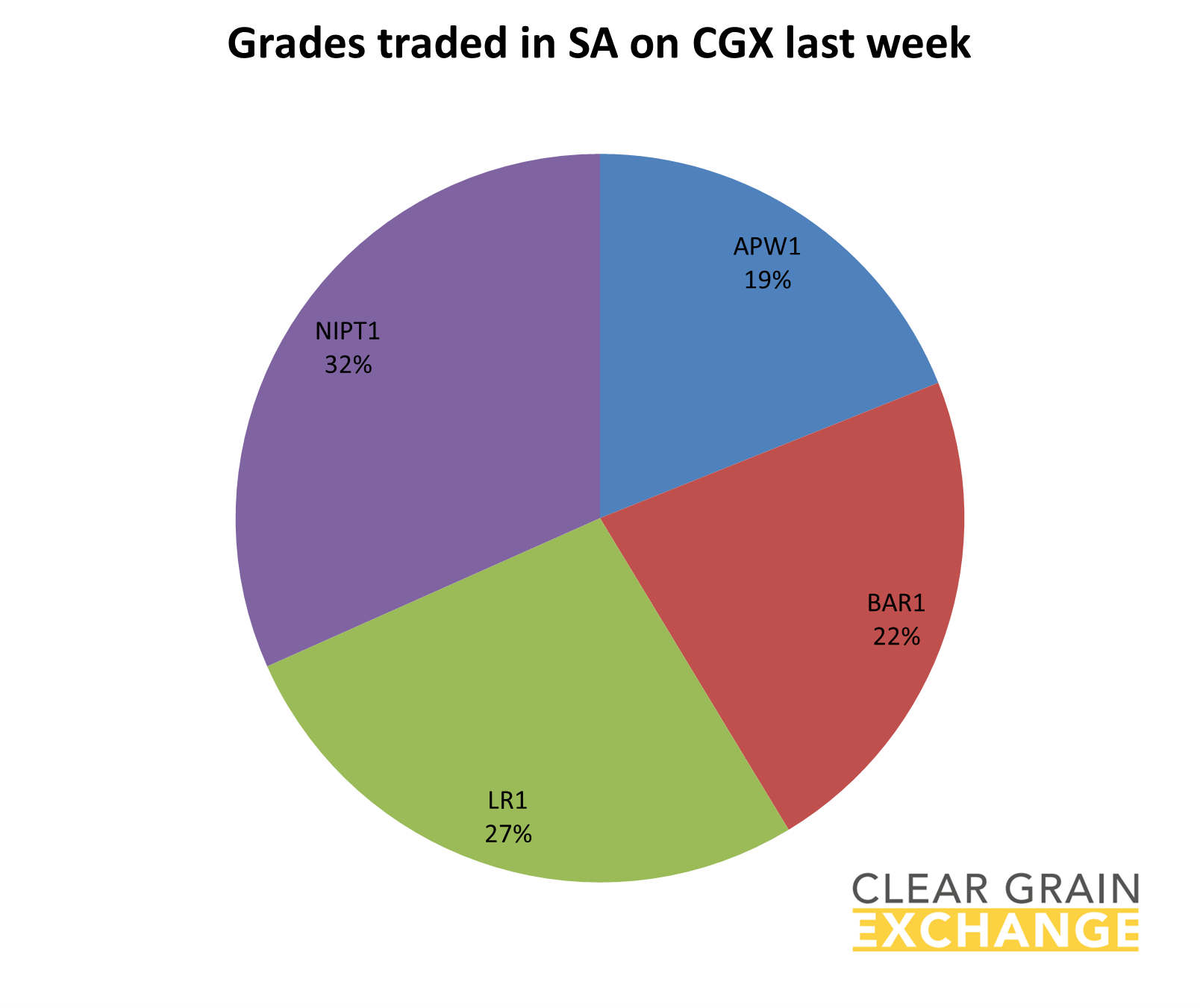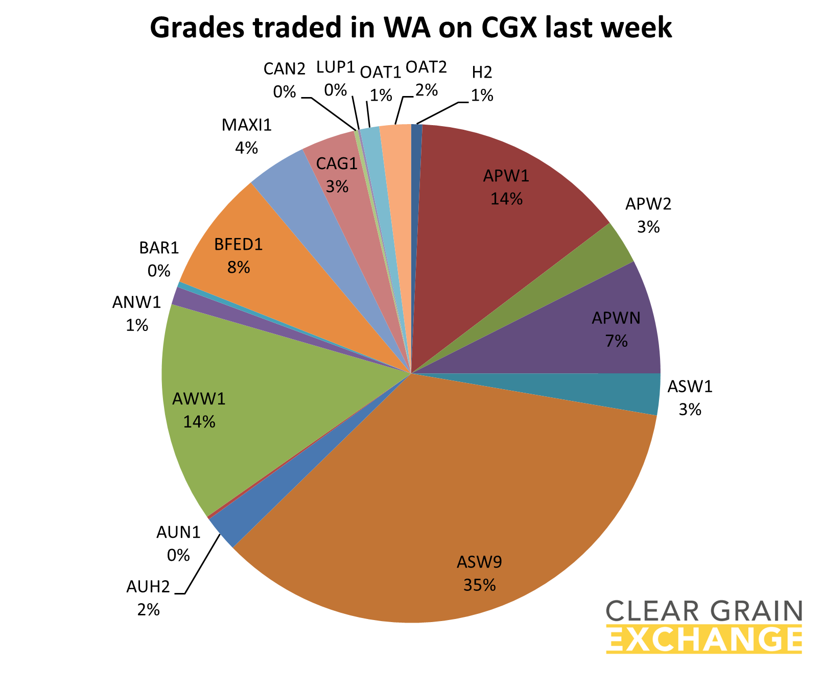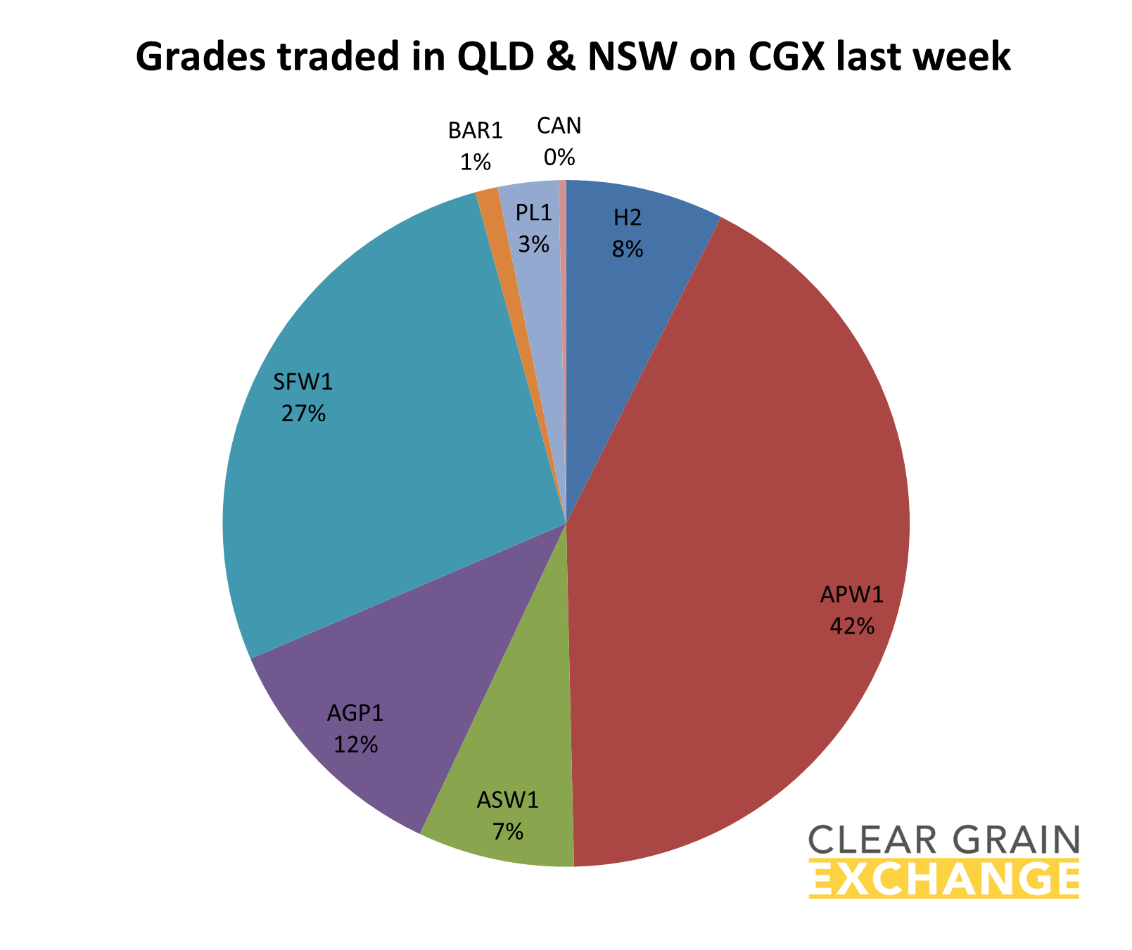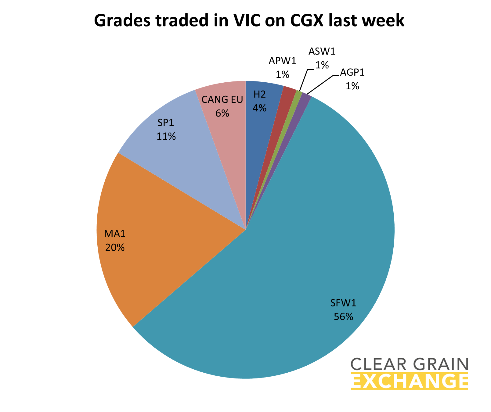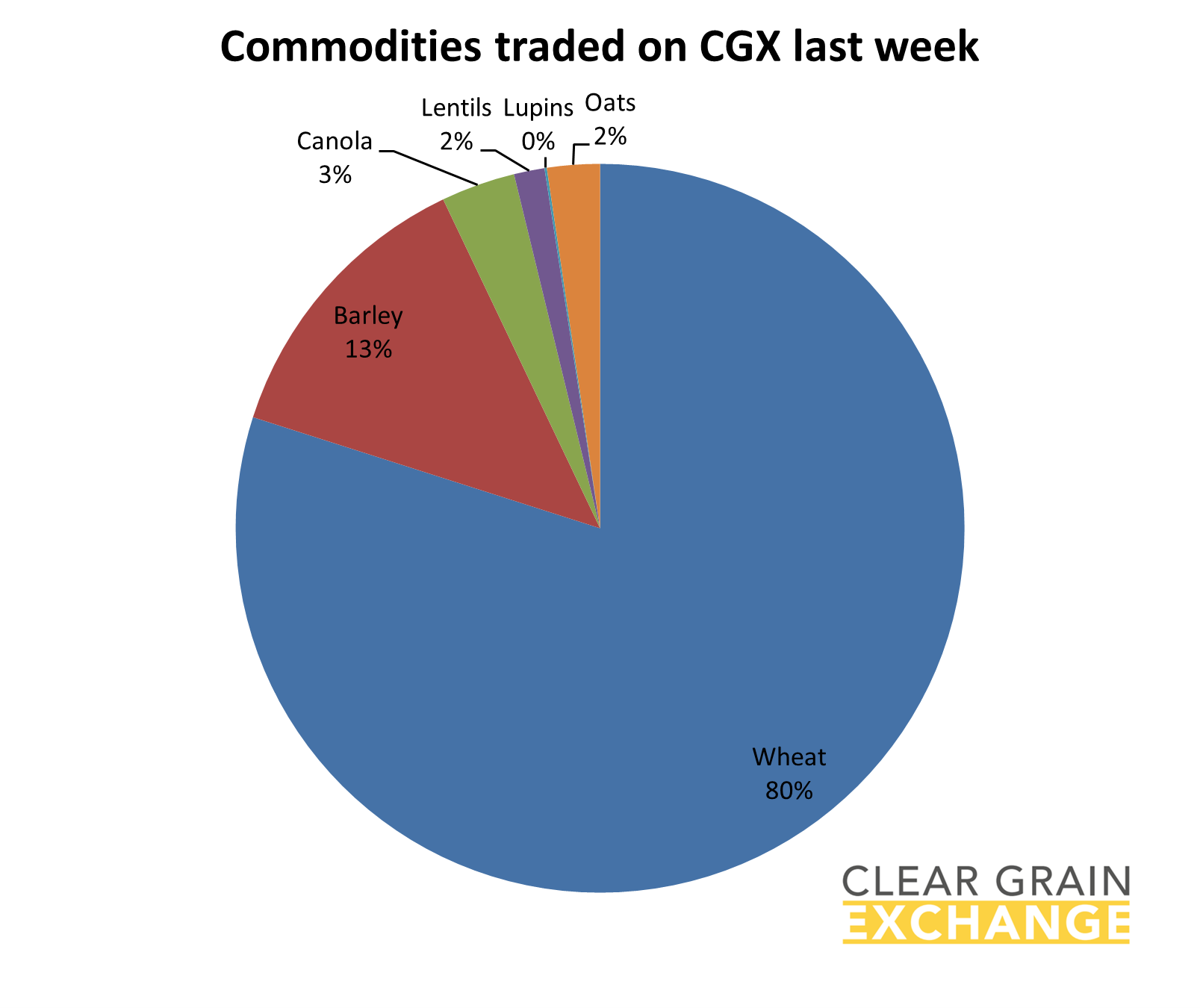 Last week saw wheat grades make up 80% of all grain traded through CGX (warehouse) and igrainX (on-farm) which aligns with volumes being held by growers across Australia.