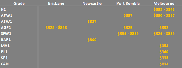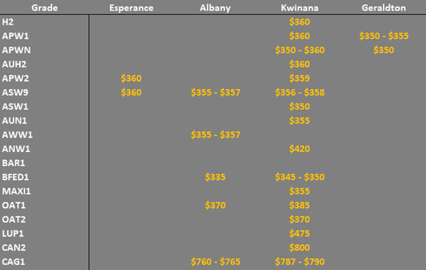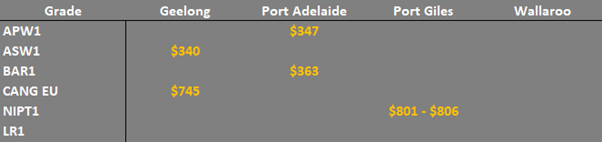 Note: GTA location differentials are used to convert prices to a port equivalent price, actual freight rates can differ particularly in the eastern states. You can offer any grade for sale to create demand.