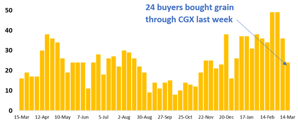 Grain offered at recent traded prices continue to attract buyer interest - 24 buyers purchased grain with more searching grain offered for sale.