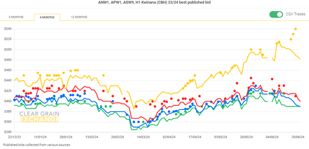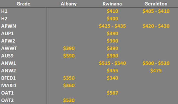 ANW1 noodle wheat traded up to $540/t last week in the west, H1 and H2 were trading $410/t and $400/t respectively, and feed barley traded $350/t in Albany as examples.