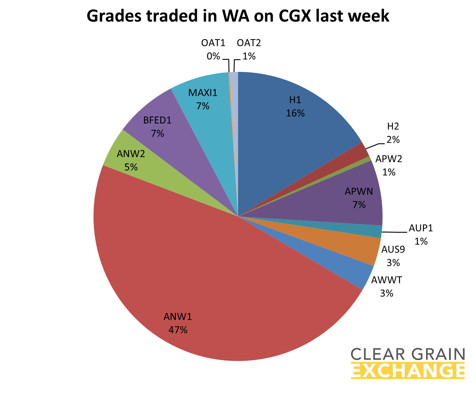 Wheat grades made up 84% of all grain traded through CGX last week, barley grades accounted for 15%, and lentils and oats made up the balance.