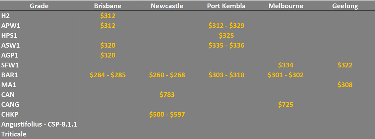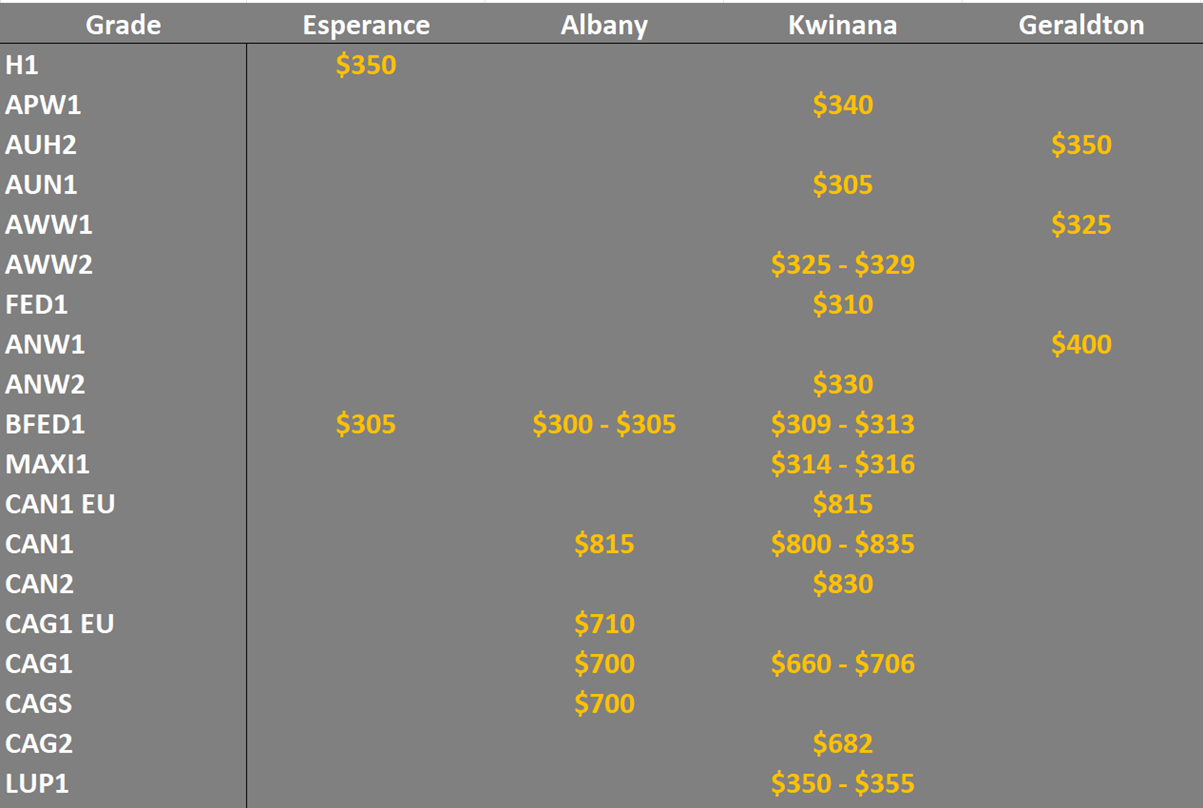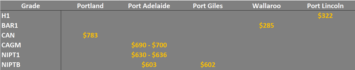 Note: GTA location differentials are used to convert prices to a port equivalent price, actual freight rates can differ particularly in the eastern states. You can offer any grade for sale to create demand.