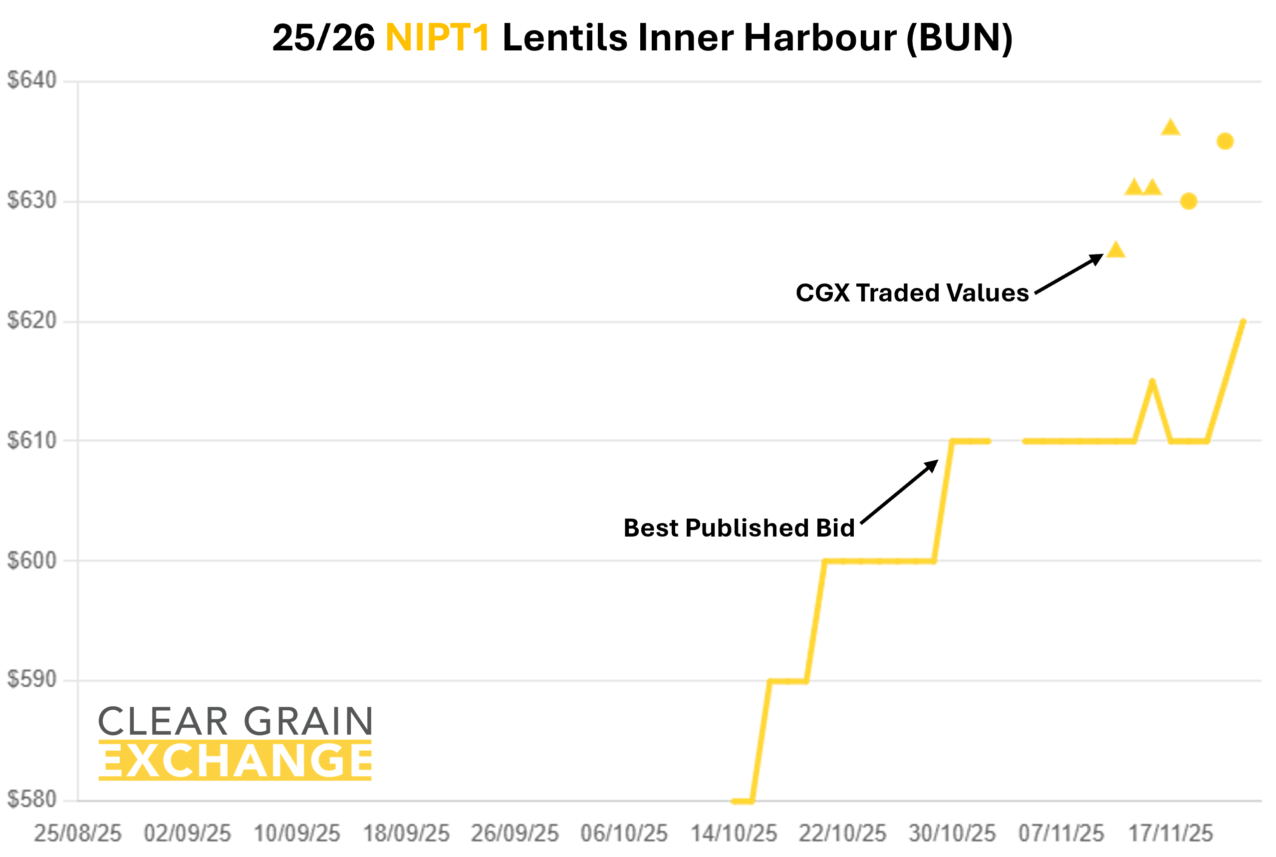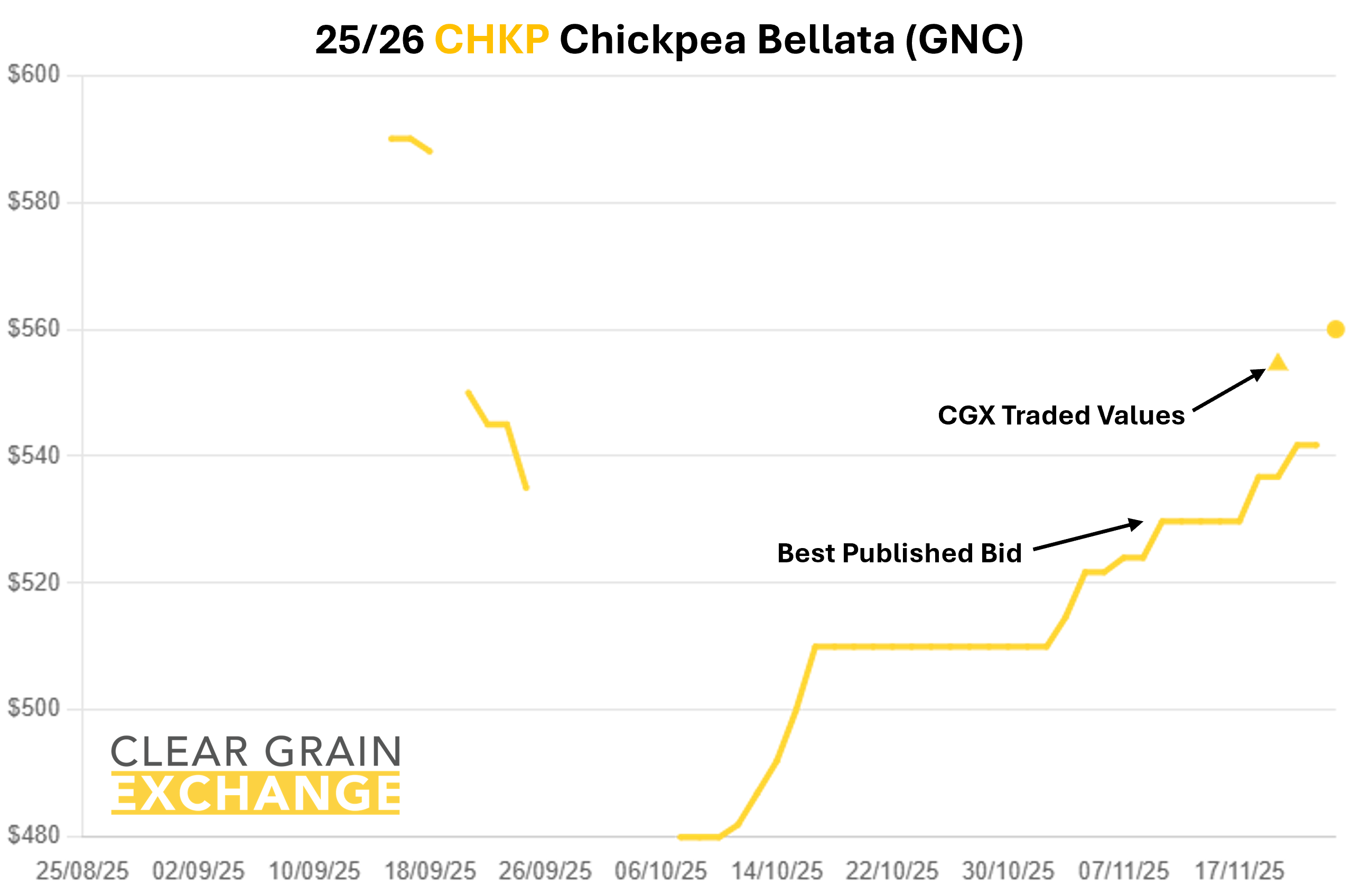 Last week 34 grades of wheat, barley, canola, chickpeas, lentils, lupins, and triticale traded with 32 buyers purchasing and 35 buyers bidding for grain through Clear Grain Exchange (grain stored in warehouse) and igrainX (grain stored on-farm).