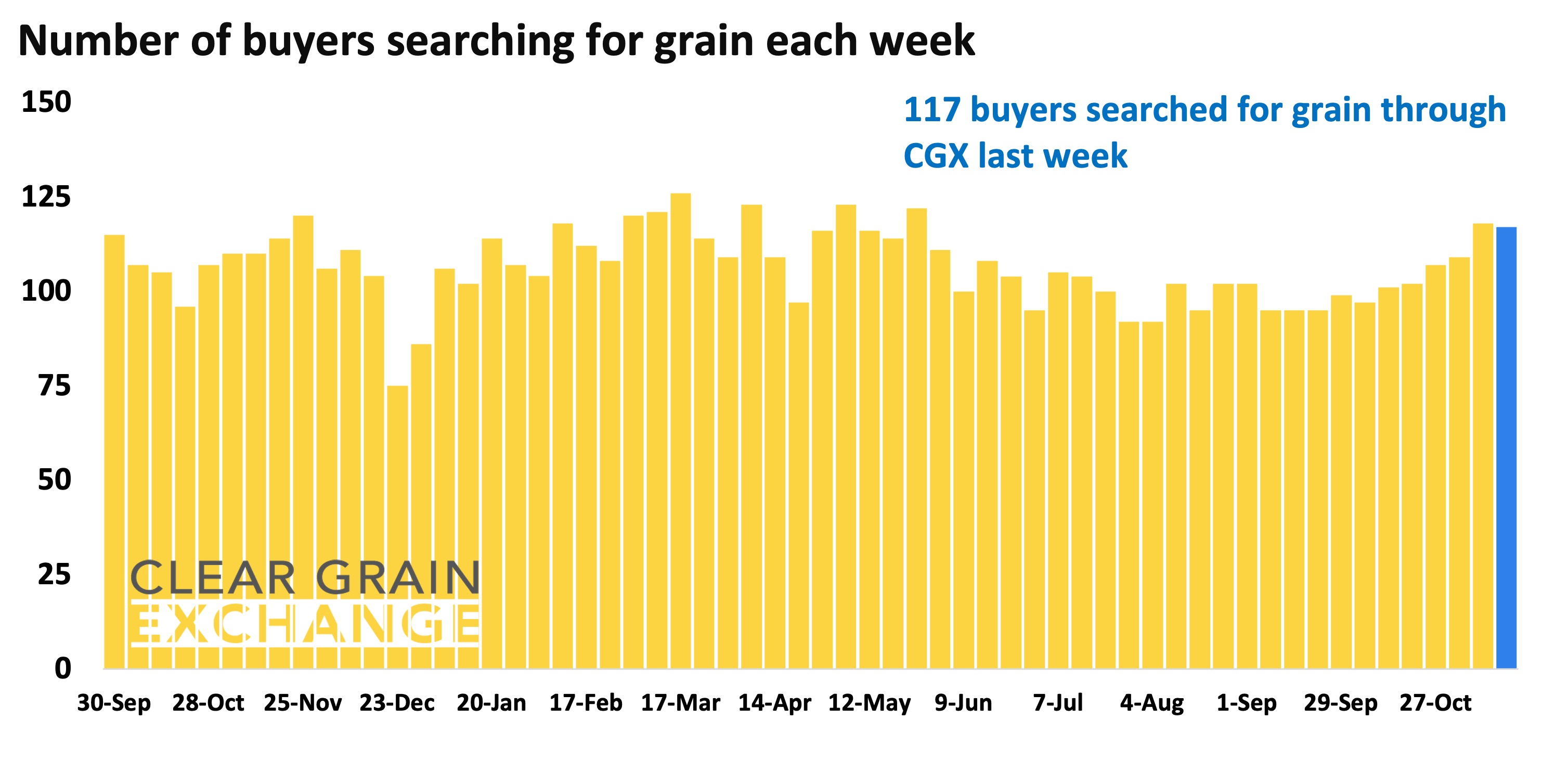 Lift in buyers searching for grower sell prices - Growers offering grain for sale through the independent exchange are impacting all buyer bids. 117 buyers were searching for grain offered for sale last week.